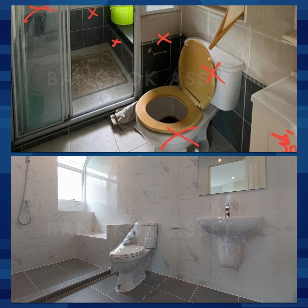 ห้องน้ำเปลี่ยนสุขภัณฑ์ใหม่ พร้อมอุปกรณ์ห้องน้ำทั้งหมด เปลี่ยนกระเบื้องพื้นแบบกันลื่น เปลี่ยนกระเบื้องผนังลายหินอ่อนสวยหรู นอกจากนี้ยังตรวจสอบดูแลระบบไฟฟ้า ประปา และระบบระบายน้ำเสีย ให้ใช้งานอย่างสะดวกปลอดภัยในมาตรฐานเดียวกับบ้านใหม่อีกด้วย