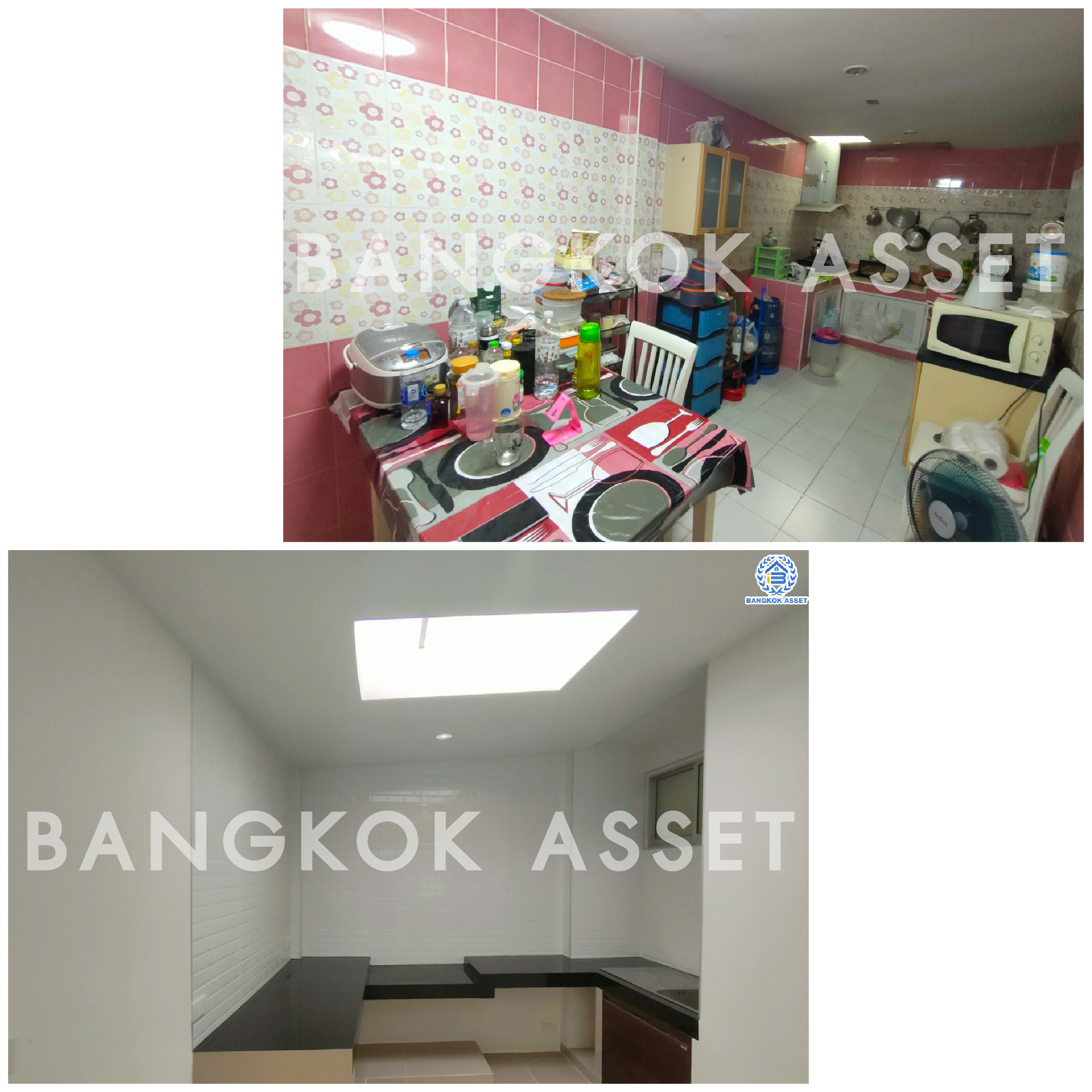 ห้องครัว เราเปลี่ยนกระเบื้องใหม่ให้ทั้งพื้นและผนังในโทนขาวสว่าง ส่วนเคาน์เตอร์ครัวเปลี่ยนกระเบื้องแกนิตโต้สีดำไม่ต้องกลัวเลอะ เพิ่มความแข็งแรง ใช้งานได้อีกนาน ส่วนฝ้าเพดานเราก็เปลี่ยนให้ใหม่ทั้งหมดครับ