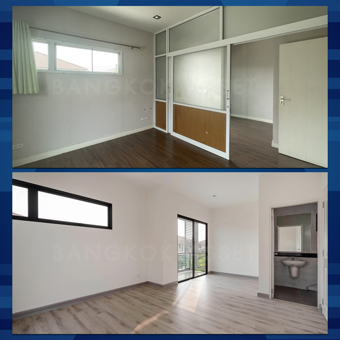 ห้องนอนทุกห้องเราเปลี่ยนเป็นพื้นไม้ลามิเนตลายเหมือนไม้จริง ดูอบอุ่น สบาย มีความหนาและแข็งแรง พร้อมเปลี่ยนประตู หน้าต่างอลูมิเนียมบานเลื่อนสีดำ และเปลี่ยนไฟดาวน์ไลท์ทุกให้ห้องเช่นกัน