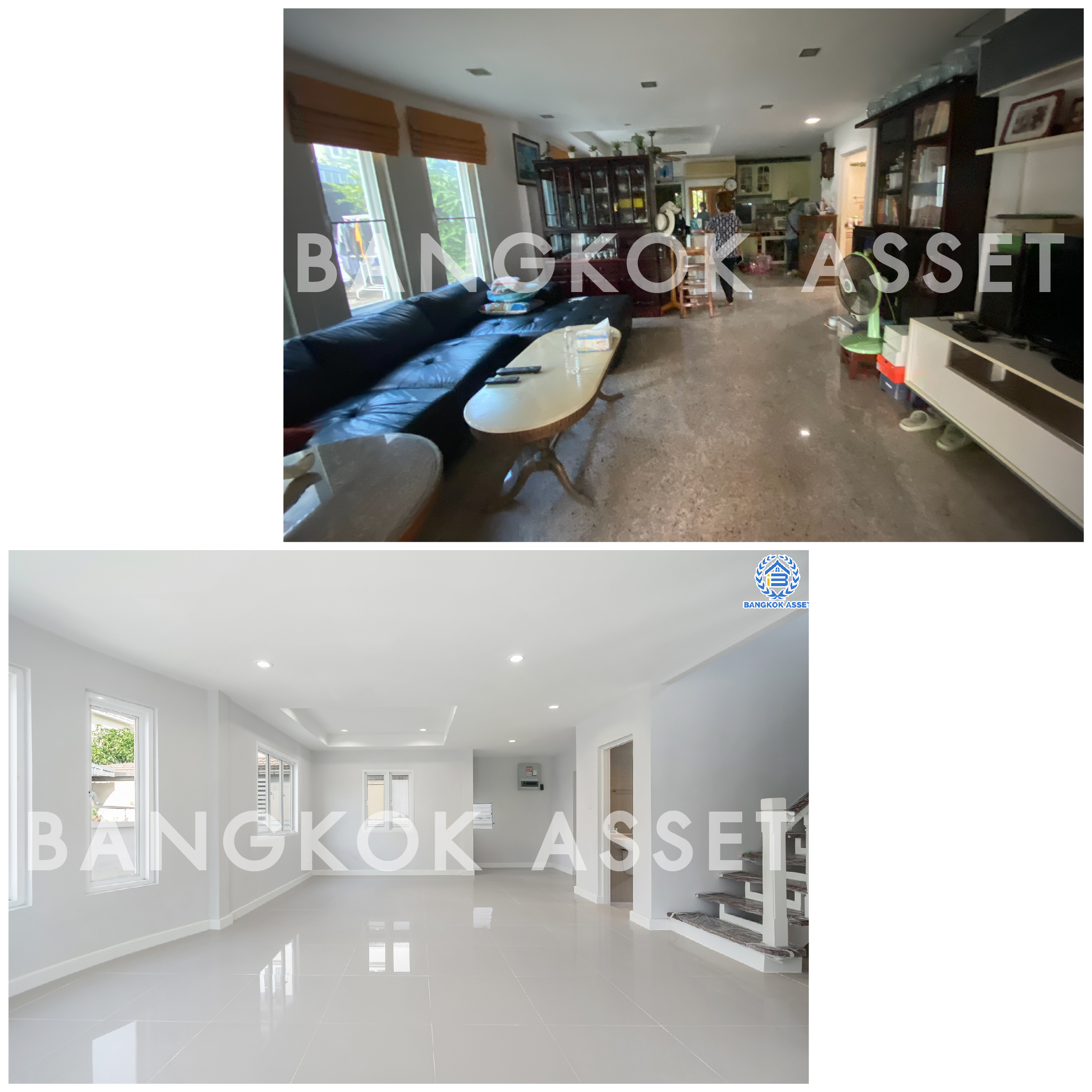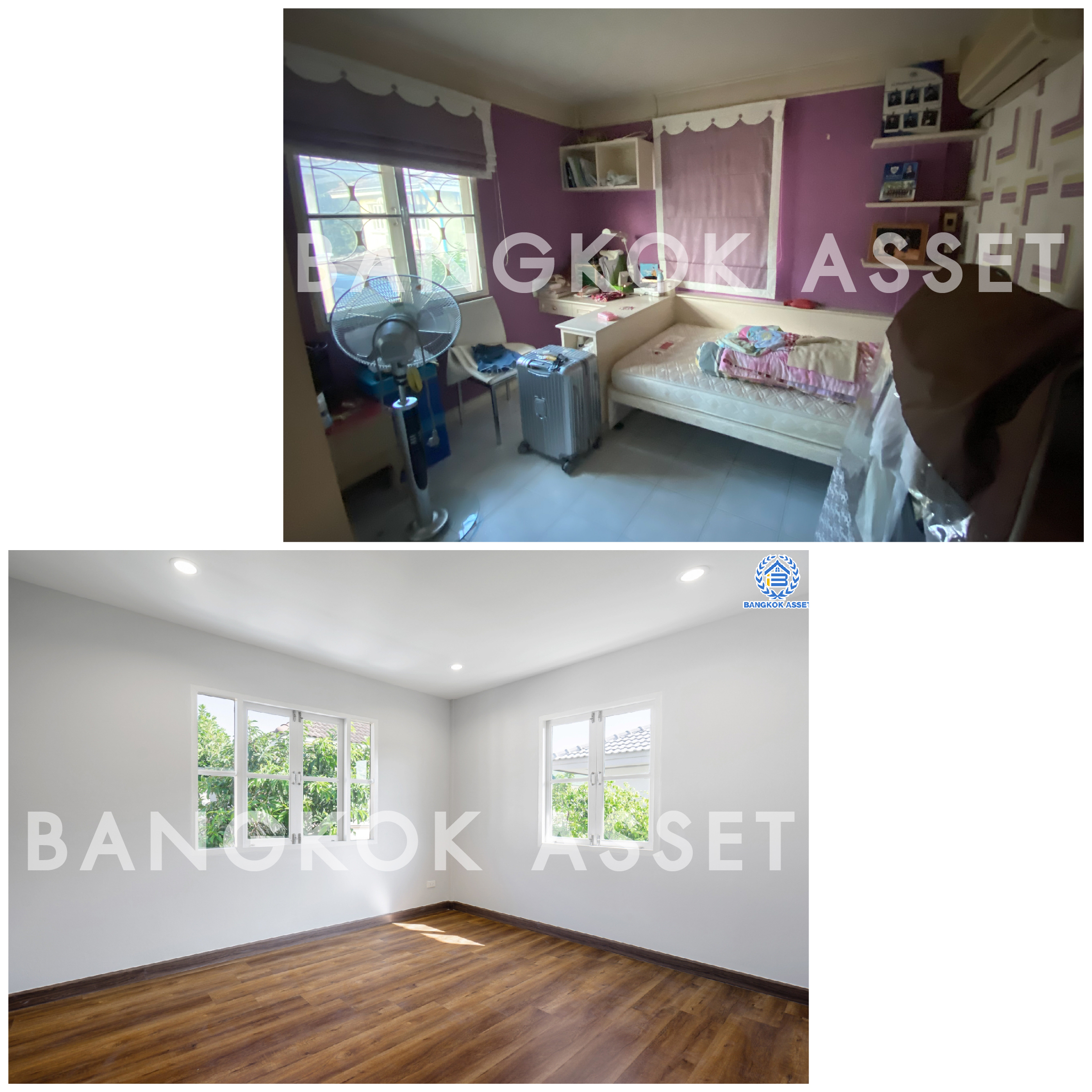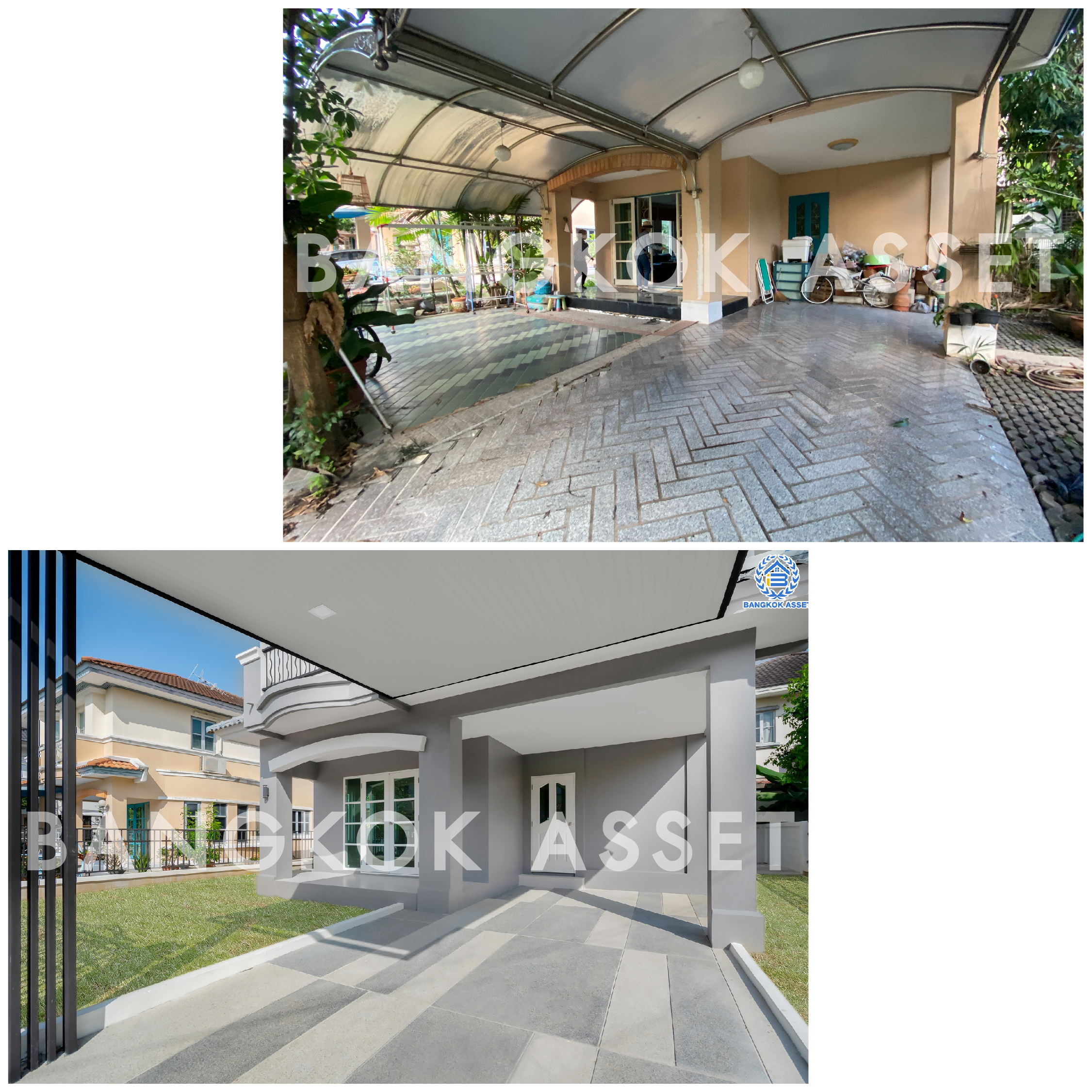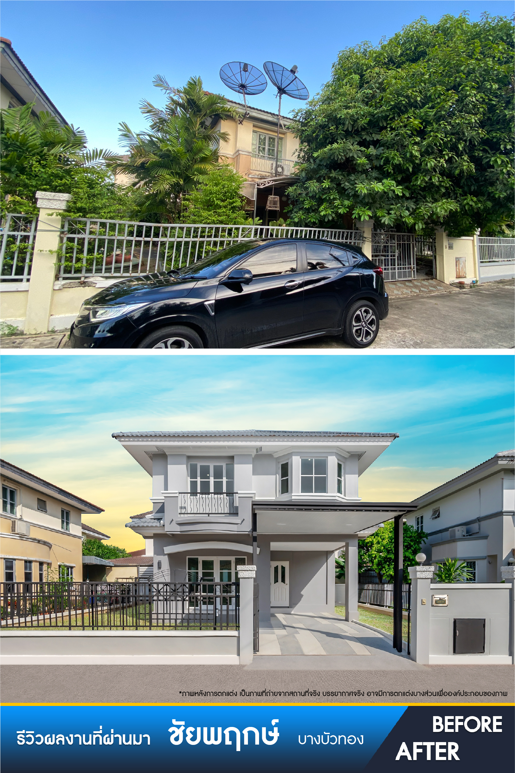 จากบ้านที่ถูกปล่อยรกร้าง เราได้แปลงสภาพตกแต่งใหม่ทั้งหลัง ไม่ว่าจะเป็นการทาสีใหม่ให้ดูขาวสว่างยิ่งขึ้น ในส่วนของหน้าบ้านและลานจอดรถ เราเคลียร์พื้นที่ทั้งหมดให้ดูโปร่งโล่ง เทพื้นทรายล้าง ปูหญ้าใหม่ ทำให้หน้าบ้านดูสวยหรูทันสมัย และมีความแข็งแรงทนทาน