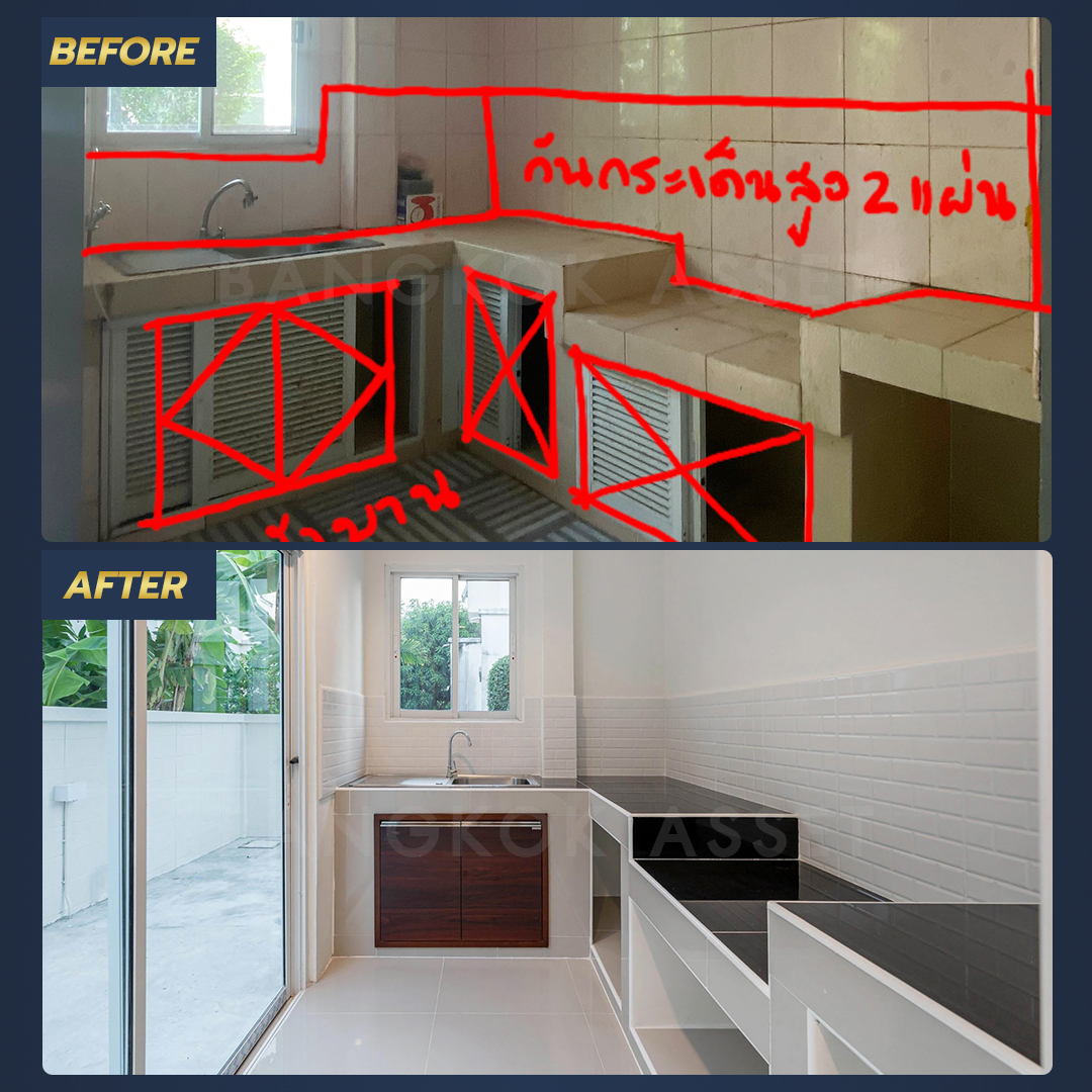 ห้องครัวเปลี่ยนพื้นกระเบื้องพื้น ผนังให้ใหม่ พร้อมใช้งานได้ยาว ๆ รวมไปถึงประตู หน้าต่าง เราก็ซ่อมแซม และเปลี่ยนใหม่อย่างดี