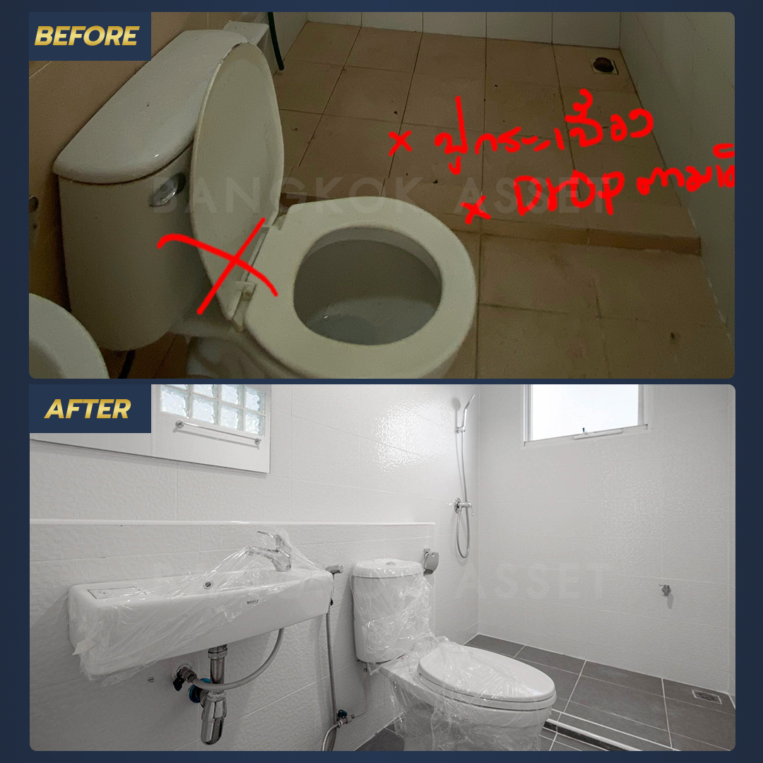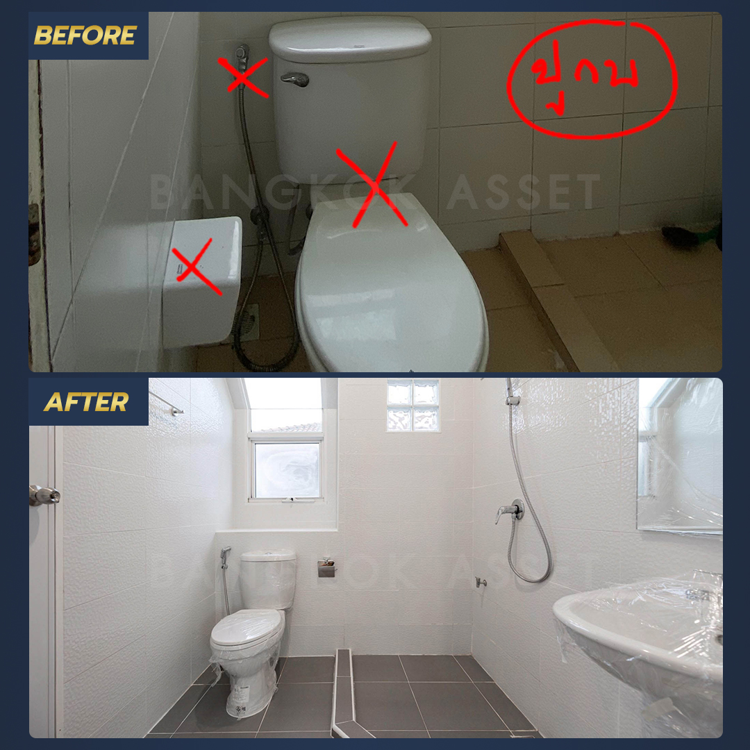 ห้องน้ำเปลี่ยนสุขภัณฑ์ใหม่ เปลี่ยนกระเบื้องพื้น กระเบื้องผนัง และยังดูตรวจสอบแลระบบน้ำประปา ระบบไฟฟ้าให้ใช้งานได้อย่างสะดวกปลอดภัยอีกด้วย