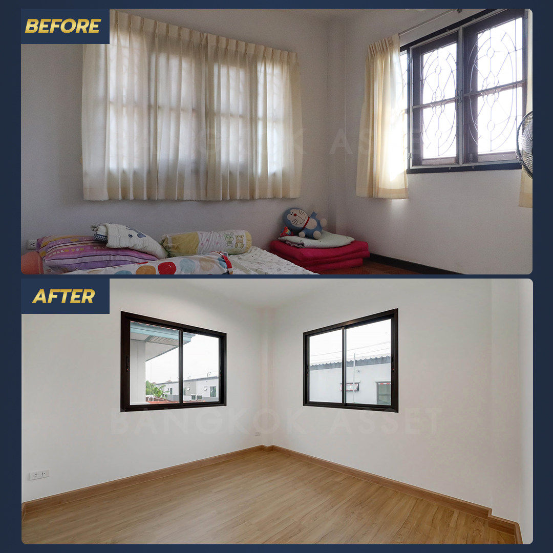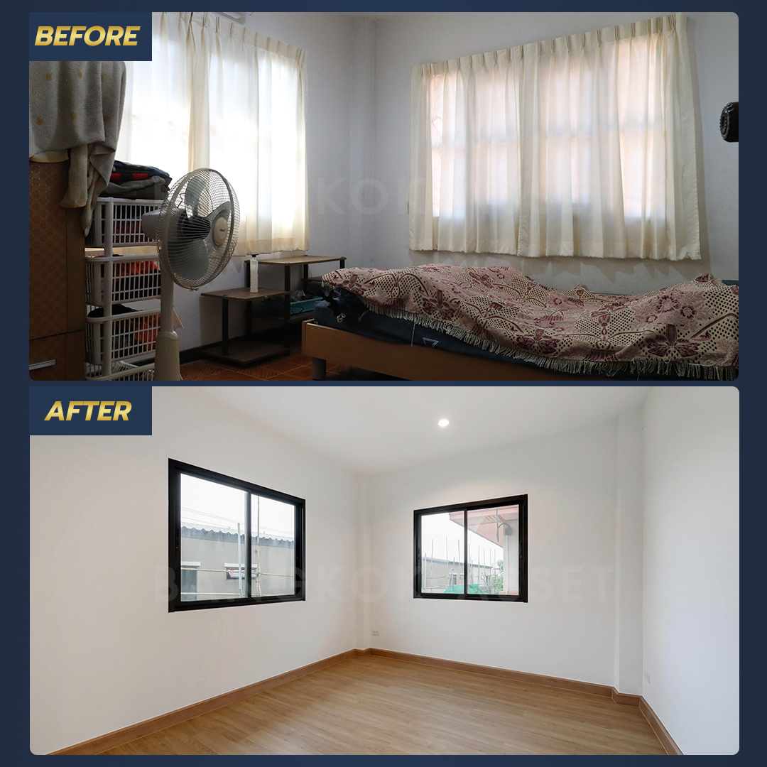 ห้องนอนทุกห้องเราเปลี่ยนเป็นพื้นไม้ลามิเนตลายเหมือนไม้จริง ดูอบอุ่น สบาย มีความหนาและแข็งแรง พร้อมเปลี่ยนประตู หน้าต่างอลูมิเนียมบานเลื่อน และเปลี่ยนไฟดาวน์ไลท์ทุกให้ห้องเช่นกัน