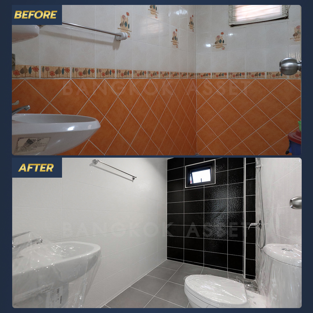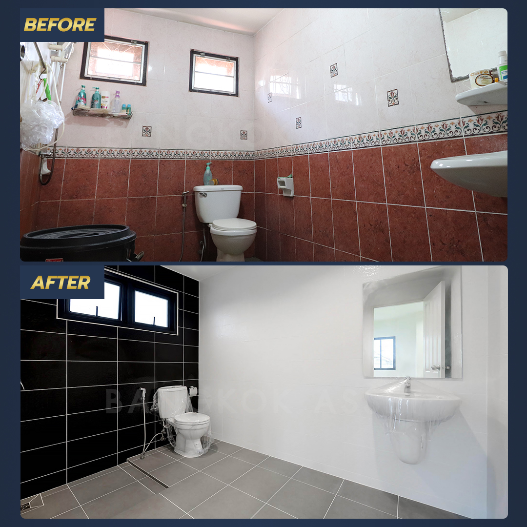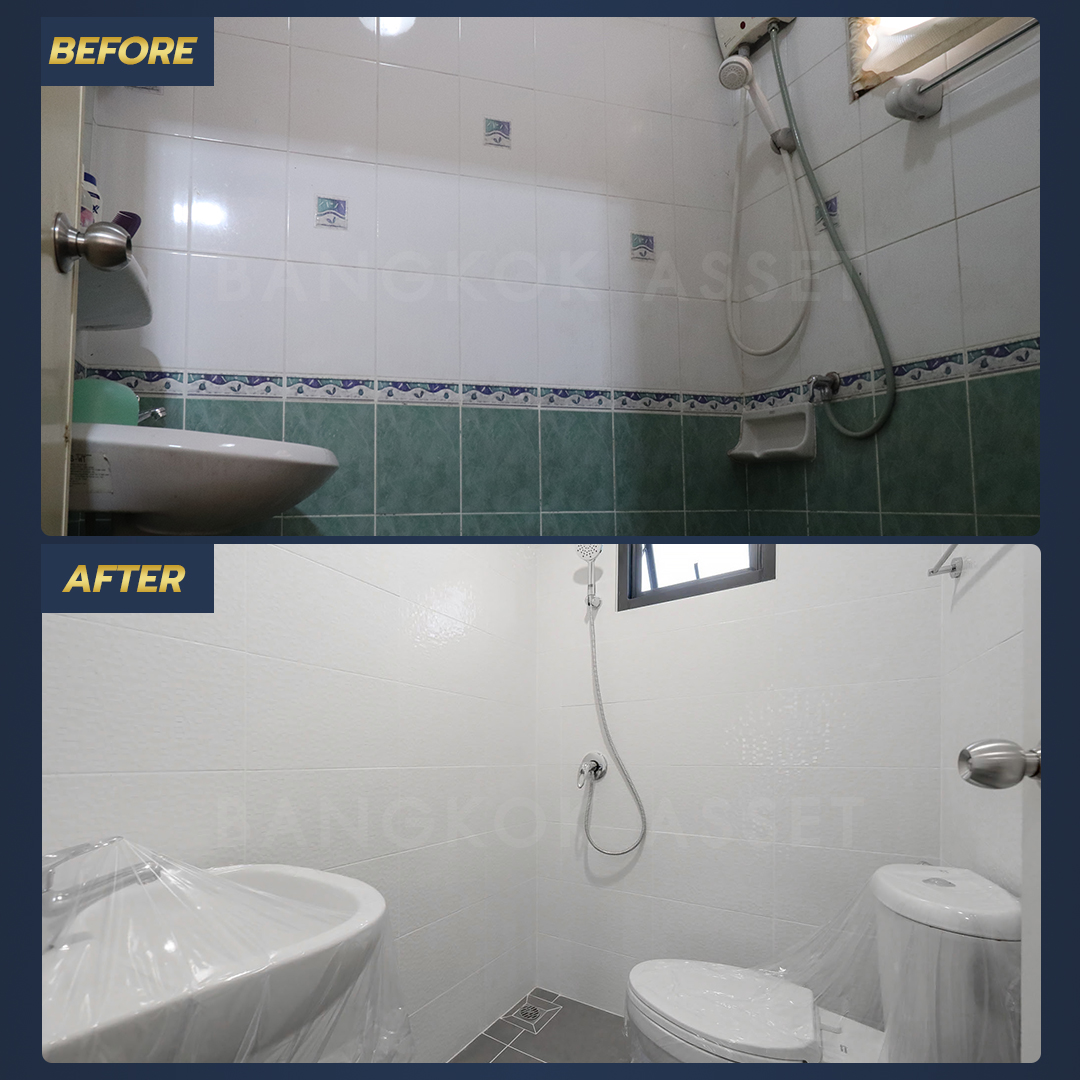 ห้องน้ำทำใหม่ทั้งหมด ไม่ว่าจะเปลี่ยนสุขภัณฑ์ใหม่ เปลี่ยนกระเบื้องผนัง เปลี่ยนอุปกรณ์ภายในห้องน้ำ และเปลี่ยนกระเบื้องพื้นแบบกันลื่น นอกจากนี้ยังดูแลตรวจสอบ ซ่อมแซม และเปลี่ยนระบบน้ำ ระบบไฟ สุขาภิบาล ให้พร้อมใช้งานได้อย่างสะดวกปลอดภัยอีกด้วย