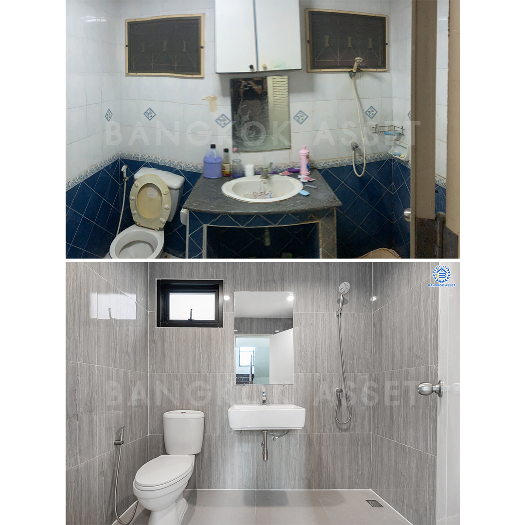 ห้องน้ำทำให้ใหม่ทั้งหมดเช่นกัน ไม่ว่าจะเปลี่ยนสุขภัณฑ์ใหม่ เปลี่ยนกระเบื้องผนังใหม่ และพื้นแบบกันลื่นเพื่อความปลอดภัย นอกจากวัสดุที่เปลี่ยนให้ใหม่หมดแล้ว เรื่องของระบบน้ำ ระบบระบายน้ำ และระบบไฟฟ้าเราก็ดูแลให้เช่นกัน