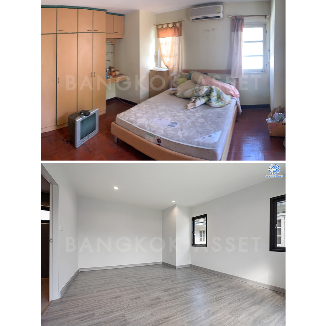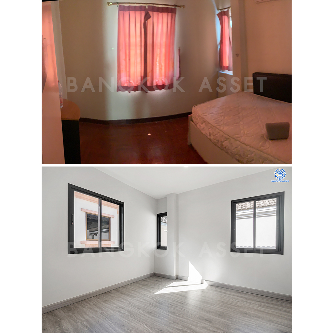 ห้องนอนทุกห้องเราเปลี่ยนประตู หน้าต่าง ฝ้าเพดานใหม่ทั้งหมด พร้อมติดไฟดาวน์ไลท์ให้เช่นกัน และเปลี่ยนพื้นเป็นลามิเนตให้ใหม่ทั้งหมด เหมือนได้บ้านใหม่บนที่ดินเดิมไม่มีผิด