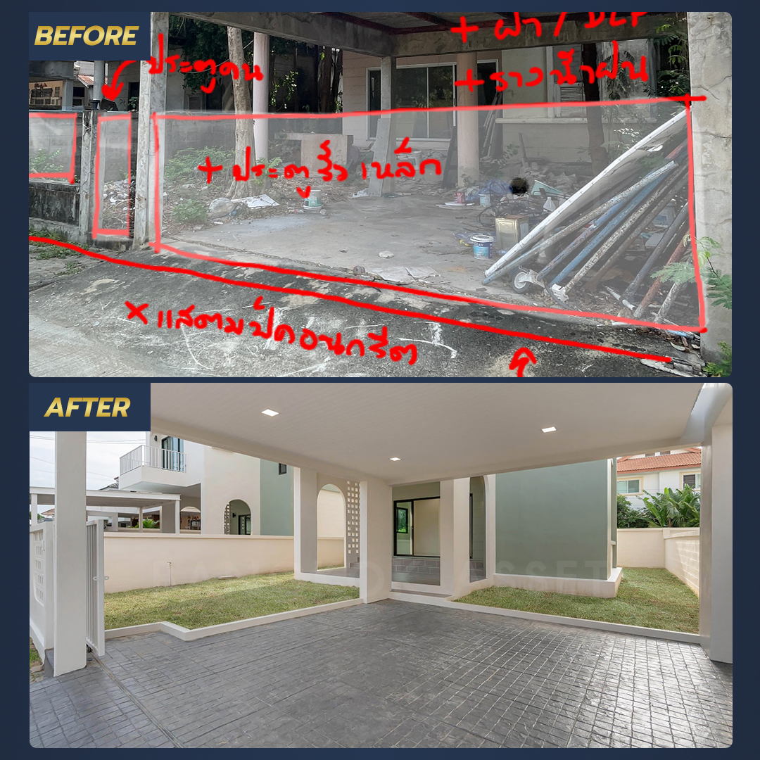 เคลียร์พื้นที่ทั้งหมดให้ดูโปร่งโล่งน่าอยู่อาศัยเปลี่ยนพื้นที่จอดรถเป็นพื้นคอนกรีตพิมพ์ลายที่ลวดลายเข้ากับตัวบ้าน ทำให้หน้าบ้านดูสวยน่าอยู่ขึ้นมาก