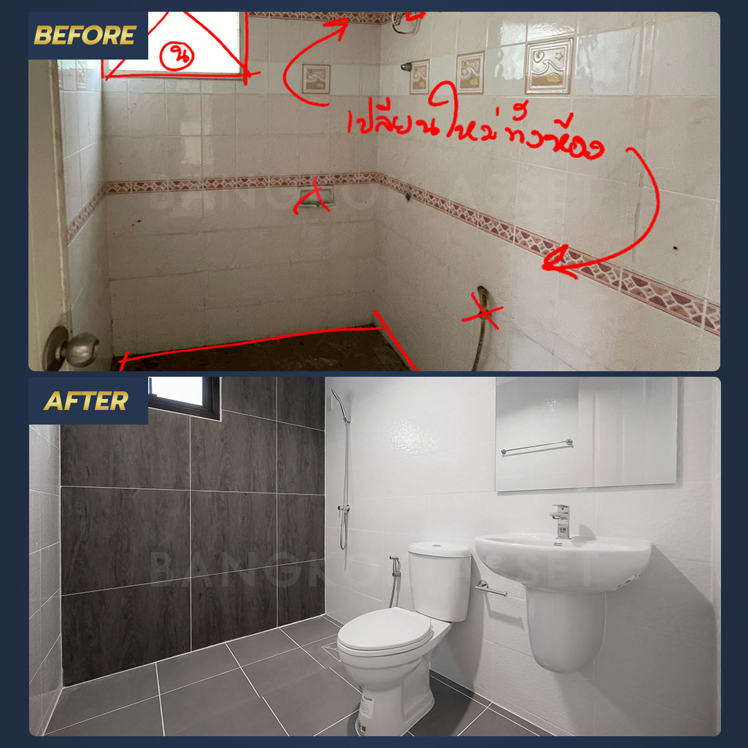 ห้องน้ำเปลี่ยทุกอย่างที่มีไม่ว่าจะสุขภัณฑ์  กระเบื้องผนัง กระเบื้องพื้นกันลื่น รวมไปถึงอุปกรณ์ในห้องน้ำ นอกจากวัสดุที่เปลี่ยนให้ใหม่แล้ว เรายังตรวจสอบ ซ่อมแซมระบบน้ำ ระบบไฟฟ้าให้ใช้งานได้อย่างสะดวกปลอดภัยอีกด้วย