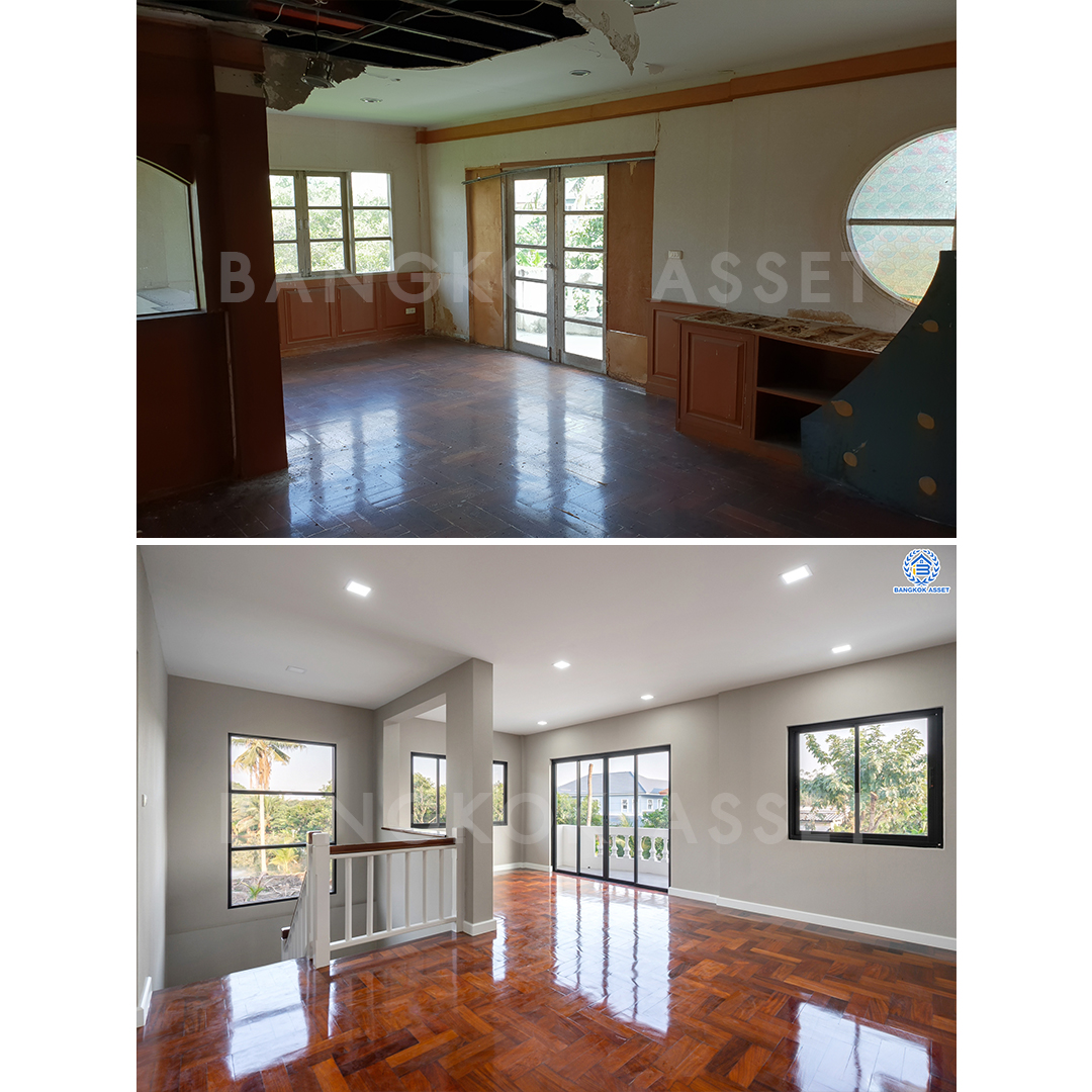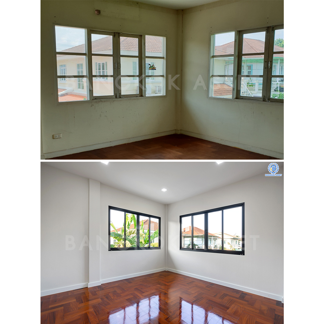 ห้องนอนทุกห้องเราขัดเคลือบพื้นไม้ปาร์เกต์ให้กลับมาสวยเหมือนของใหม่ นอกนั้นเปลี่ยนใหม่ทั้งหมดไม่ว่าจะเป็นประตู หน้าต่าง ฝ้าเพดาน พร้อมติดไฟดาวน์ไลท์ให้เช่นกัน ทั้งหมดนี้ช่วยให้บ้านดูสวยโมเดิร์นขึ้นมาจริง ๆ