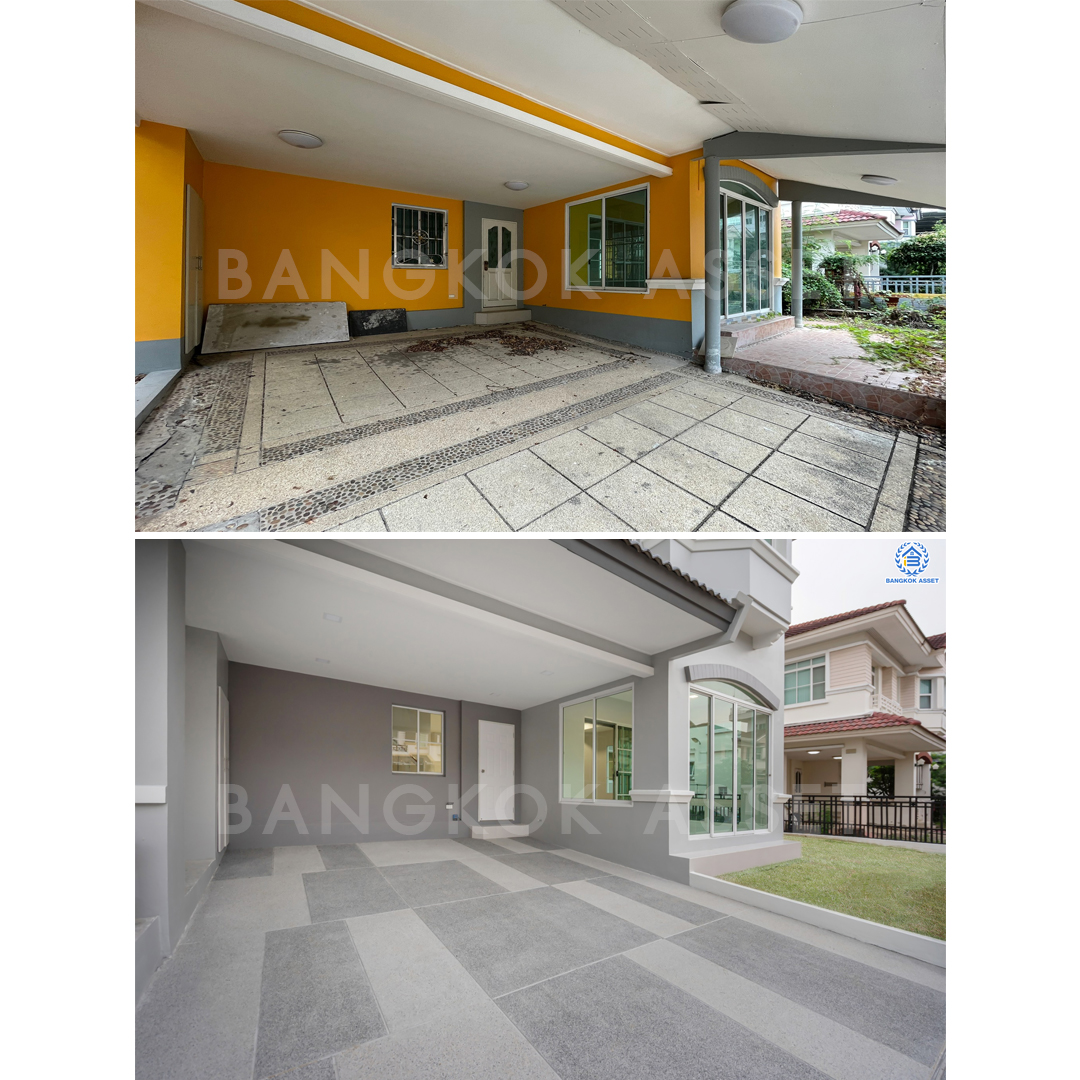 หน้าบ้านและที่จอดรถ เราเคลียร์พื้นที่ให้ดูโปร่งโล่ง และทาสีใหม่ให้เป็นธีมเดียวกันทั้งหลังรวมไปถึงรั้วบ้าน ส่วนพื้นที่จอดรถเราเททรายล้างที่มีแข็งแรง และกันลื่นได้เป็นอย่างดี ด้วยลวดลายและการเลือกใช้สีเดียวกับตัวบ้าน ทำให้บ้านดูหรูน่าอยู่มากยิ่งขึ้น
