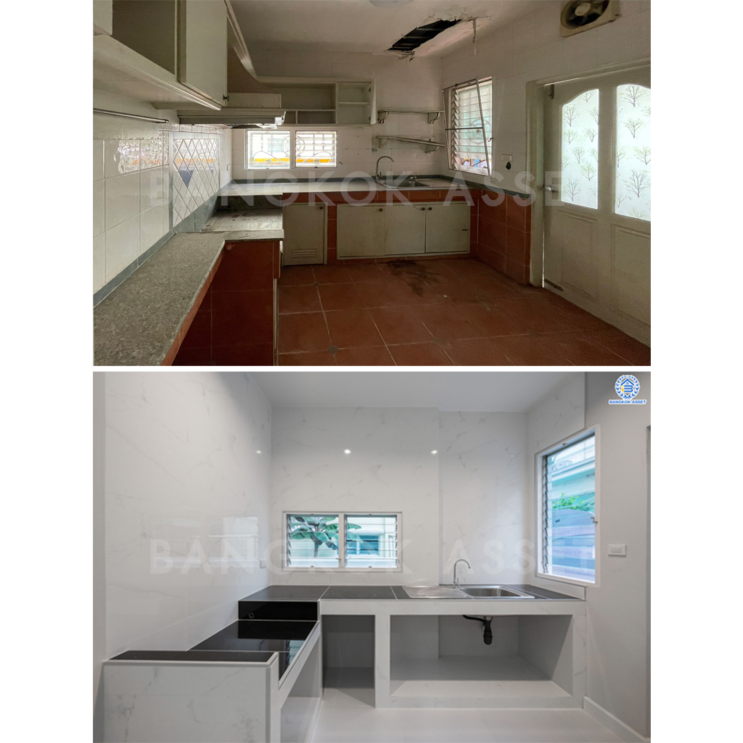 ห้องครัว เรียกว่าเปลี่ยนทุกอย่างจริง ๆ ตั้งแต่ฝ้าเพดาน กระเบื้องพื้นและผนัง ประตู หน้าต่าง ส่วนเคาน์เตอร์ครัวเราก่อครัวปูนให้ใหม่ Top ด้วยกระเบื้องให้ความแข็งแรง ทนทาน ใช้งานได้กันอีกนานไปเลยครับ