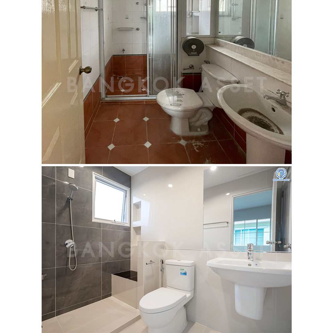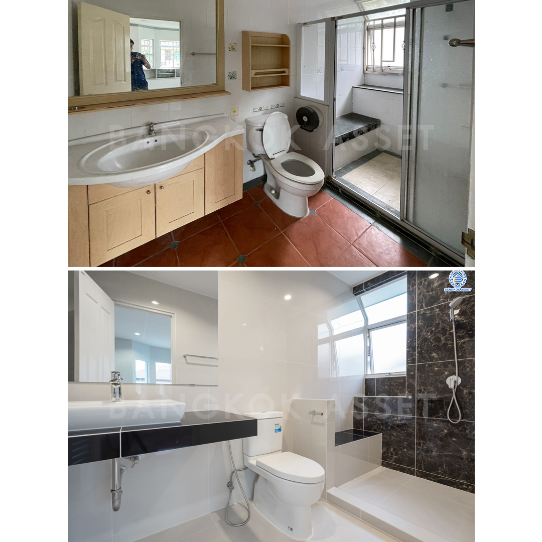 ห้องน้ำทำให้ใหม่ทั้งหมดเช่นกัน ไม่ว่าจะเปลี่ยนสุขภัณฑ์ใหม่ เปลี่ยนกระเบื้องผนังใหม่ลายหินอ่อน และเปลี่ยนกระเบื้องพื้นแบบกันลื่นเพื่อความปลอดภัย นอกจากวัสดุที่เปลี่ยนให้ใหม่หมดแล้ว เรื่องของระบบน้ำ ระบบระบายน้ำ และระบบไฟฟ้าเราก็ดูแลให้พร้อมใช้งานเช่นกันครับ อยากทำบ้านสวยใหม่น่าอยู่แบบนี้ ทักมาได้เลยครับ