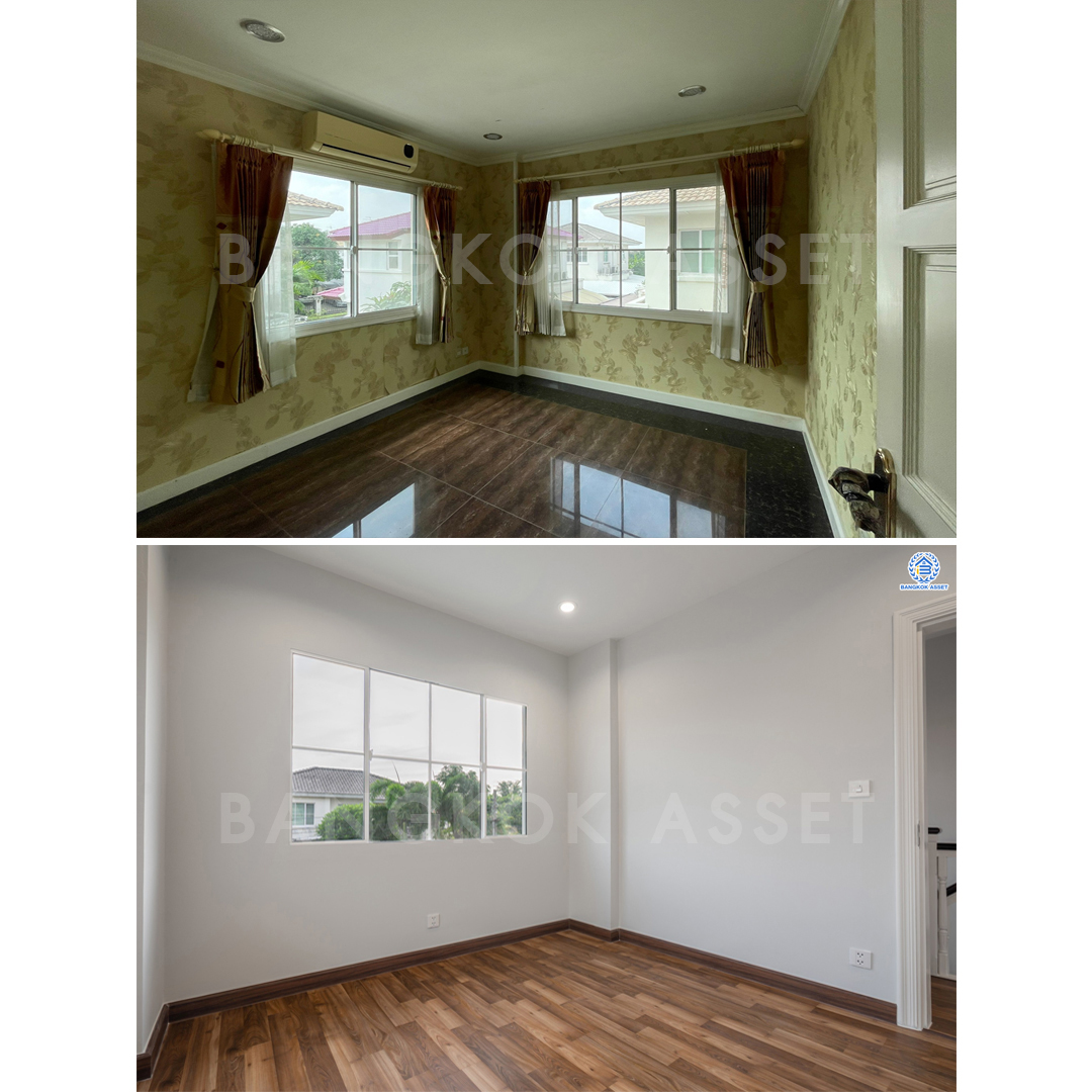 ห้องนอนทุกห้องเราเปลี่ยนเป็นพื้นไม้ลามิเนตใหม่ทั้งหมด คุมโทนสีภายในห้องเป็นโทนขาวสว่างช่วยให้ดูโปร่งโล่งสบายตามากขึ้นทุกห้อง ไม่ต่างกับไปดูบ้านตัวอย่างที่โครงการใหม่ ๆ เลยครับ