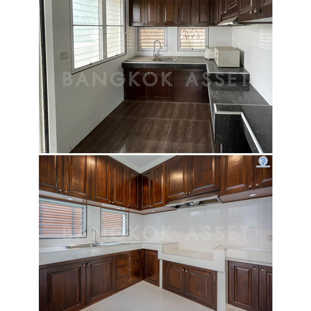 ห้องครัว ในส่วนเคาน์เตอร์ครัวเป็นแบบก่อปูนมีความแข็งแรง ทนทาน ใช้งานได้ยาวอยู่แล้ว จะทุบทำใหม่ก็น่าเสียดาย แค่เปลี่ยนกระเบื้องให้ใหม่ทั้งหมด รวมถึงพื้น ก็สวยใหม่ น่าใช้งานไม่แพ้กัน