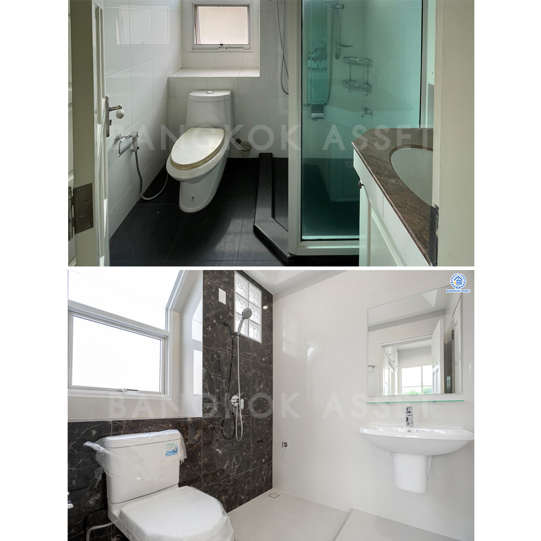ห้องน้ำ เปลี่ยนสุขภัณฑ์ใหม่น่าใช้งานยิ่งขึ้น ปูกระเบื้องใหม่ทั้งหมด ทั้งผนังและพื้นที่ใช้กระเบื้องแบบกันลื่น เพื่อความปลอดภัยในระยะยาว