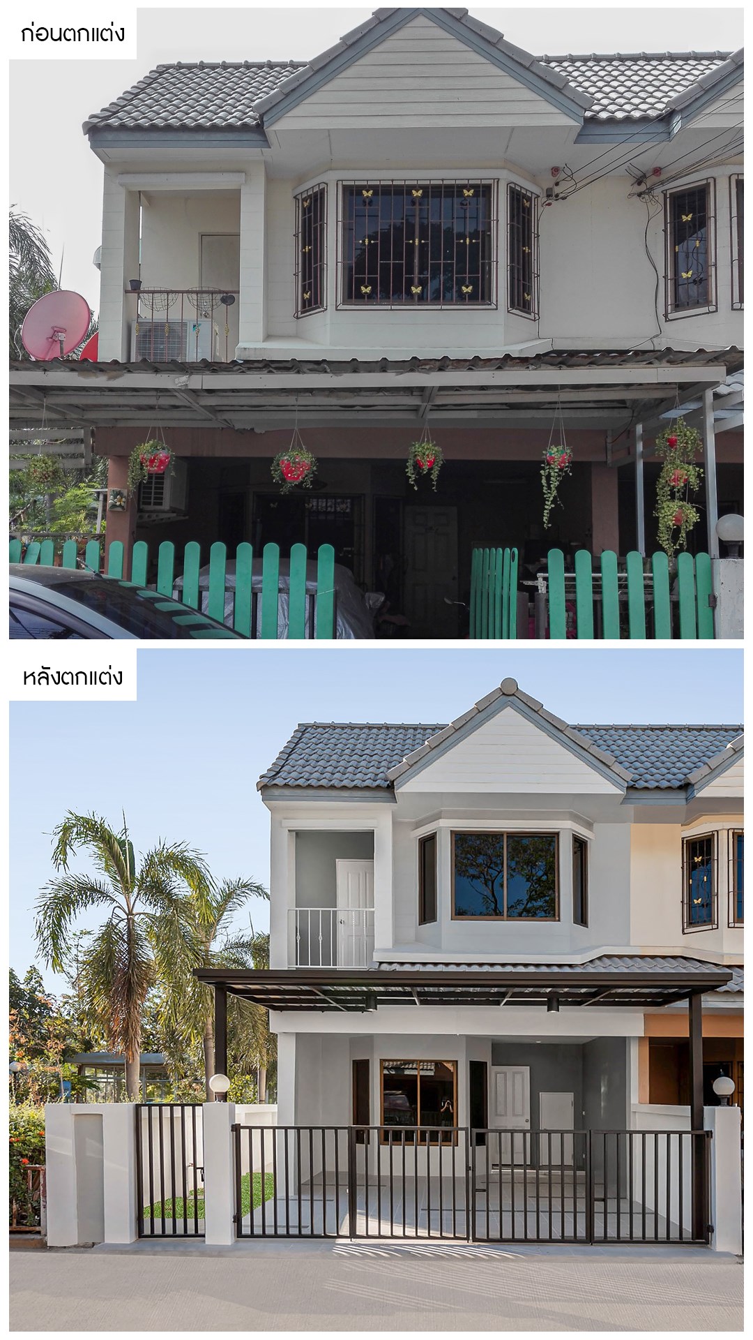 จากบ้านที่ไม่มีความโดดเด่น รั้วและหน้าต่างที่เก่าไม่ทันสมัย เราได้ทำการปรับปรุงใหม่ทั้งหมด โดยการเปลี่ยนสีบ้านใหม่เป็นโทนขาวสว่าง เพื่อให้บ้านสวยงามสดใสสะอาดตา อีกทั้งยังเคลียร์ในส่วนของหน้าบ้านให้ดูโปร่ง โล่ง เปลี่ยนรั้วเป็นแบบทันสมัยคุณภาพเยี่ยม เพื่อให้มีลมพัดเข้าทางหน้าบ้านตลอดเวลาด้วยครับ