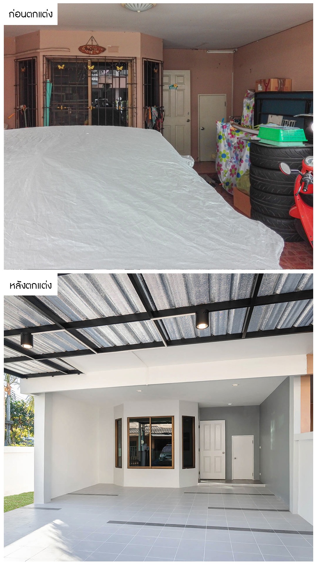 โรงรถที่เน้นความโปร่ง กว้าง เราได้ทำการต่อเติมหลังคาโรงรถให้เป็นเมทัลชีทกันความร้อน นอกจากนั้นเรายังปูพื้นด้วยกระเบื้องกันลื่น ลายสุดโดดเด่นที่เป็นเอกลักษณ์สไตล์บ้านบางกอกครับ