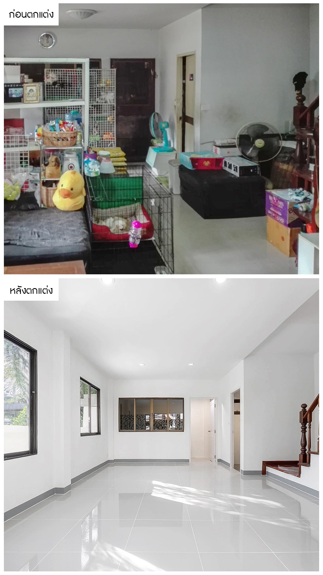 ภายในทาสีใหม่โดยเลือกใช้สีขาว ที่ช่วยให้ภายในดูกว้างขวาง และสะอาดตา พร้อมปูพื้นด้วยกระเบื้องแกรนิโต้แผ่นใหญ่ ที่ทั้งสวยงาม และง่ายต่อการทำความสะอาด พร้อมไฟดาวน์ไลท์ที่นิยมใช้ในบ้านยุคใหม่และทำให้บ้านดูมีมิติมากขึ้น