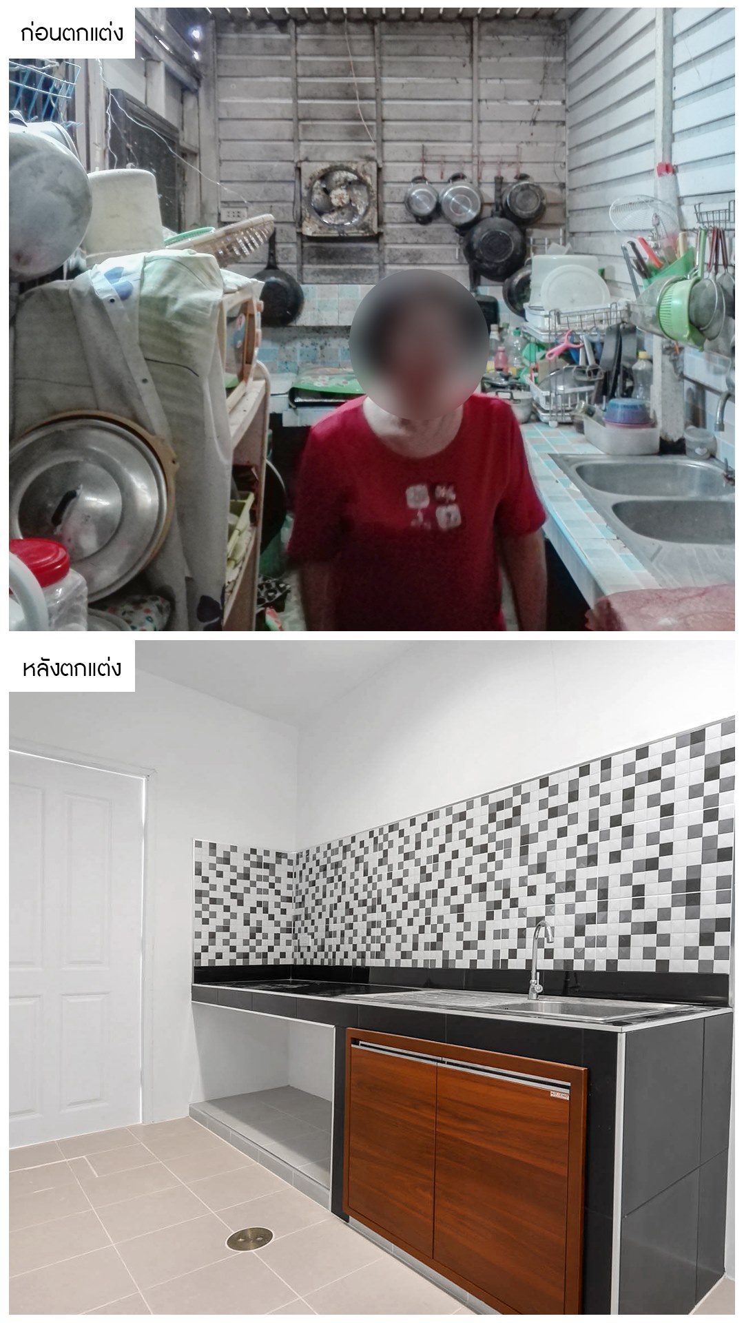 จากเดิมที่ห้องครัวมีสภาพเก่า ไม่พร้อมใช้งาน เพื่อให้ตอบโจทย์ทุกการอยู่อาศัย เราได้ทำการรีโนเวทใหม่ทั้งหมด ทั้งปูกระเบื้องที่ง่ายต่อการทำความสะอาด เปลี่ยนสีโทนสว่างที่ช่วยทำให้ห้องครัวดูโปร่ง โล่ง และต่อเติมครัวเคาน์เตอร์ ซิ้งล้างจาน แผงกันกระเด็น ฯลฯ ครบครันทุกการใช้งานเลยครับ
