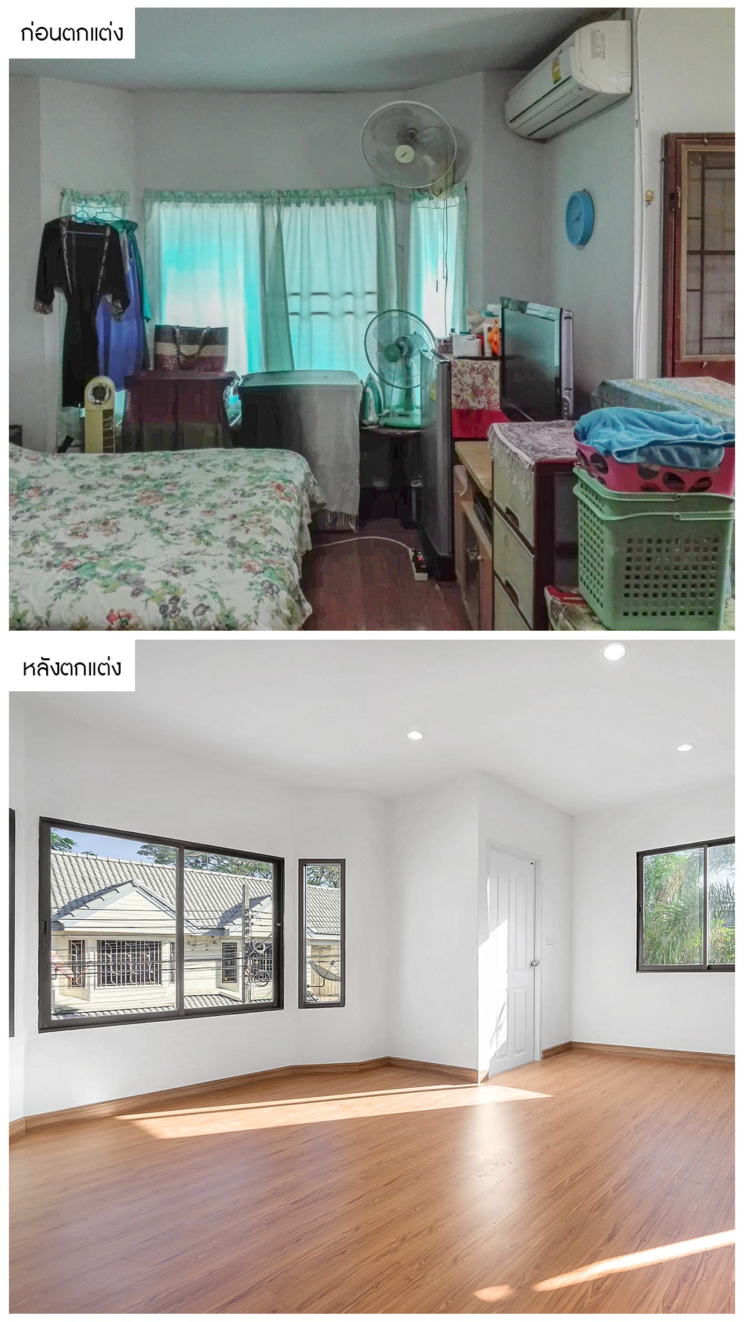 ห้องนอนได้รับการปรับปรุง โดยทาสีภายในใหม่ทั้งหมด พร้อมเปลี่ยนพื้นให้เป็นพื้นไม้ลามิเนตที่มีลวดลายสวยงาม และทนรอยขีดข่วน พร้อมหน้าต่างกระจกแผ่นใหญ่ที่ทำให้ห้องปลอดโปร่งและสามารถรับแสงธรรมชาติได้อย่างเต็มที่ ทำให้ห้องนอนกลายเป็นห้องที่น่าพักผ่อนมากยิ่งขึ้น