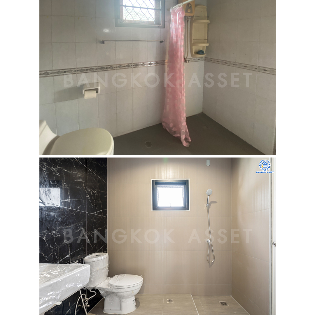 ห้องน้ำเรียกว่าทำให้ใหม่ทั้งหมด ไม่ว่าจะเปลี่ยนสุขภัณฑ์ใหม่ เปลี่ยนกระเบื้องผนังใหม่ และเปลี่ยนกระเบื้องพื้นแบบกันลื่นเพื่อความปลอดภัย นอกจากวัสดุที่เปลี่ยนให้ใหม่หมดแล้ว ระบบระบายน้ำ และระบบไฟฟ้าเราก็ดูแลให้ครบ