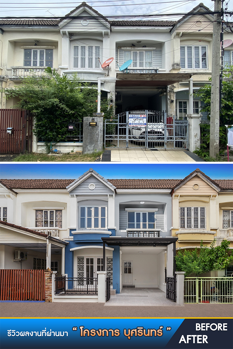 จากทาวน์โฮมหลังเก่า เราได้แปลงสภาพตกแต่งใหม่ทั้งหลัง ไม่ว่าจะเป็นการทาสีใหม่ให้ดูขาวสว่างยิ่งขึ้น รวมไปถึงรั้วหน้าบ้าน ส่วนหลังคาลานจอดรถก็ทำให้ใหม่ โดยใช้แบบเมทัลชีทที่มีฉนวนกันความร้อนให้ด้วย