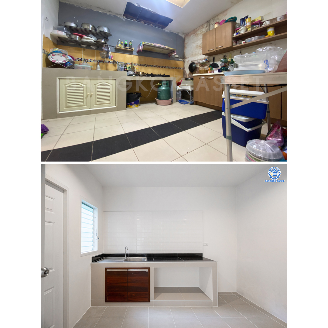 ห้องครัว เป็นอีกห้องที่สำคัญ เราเปลี่ยนวัสดุใหม่ทั้งหมดเลยครับ ไม่ว่าจะ ฝ้า เพดาน กระเบื้องพื้นและผนัง เปลี่ยนกระเบื้องเคาน์เตอร์ครัวใช้งานได้ยาวๆ ไปเลย ไม่ต้องหาช่างมาต่อเติมใหม่ให้วุ่นวาย