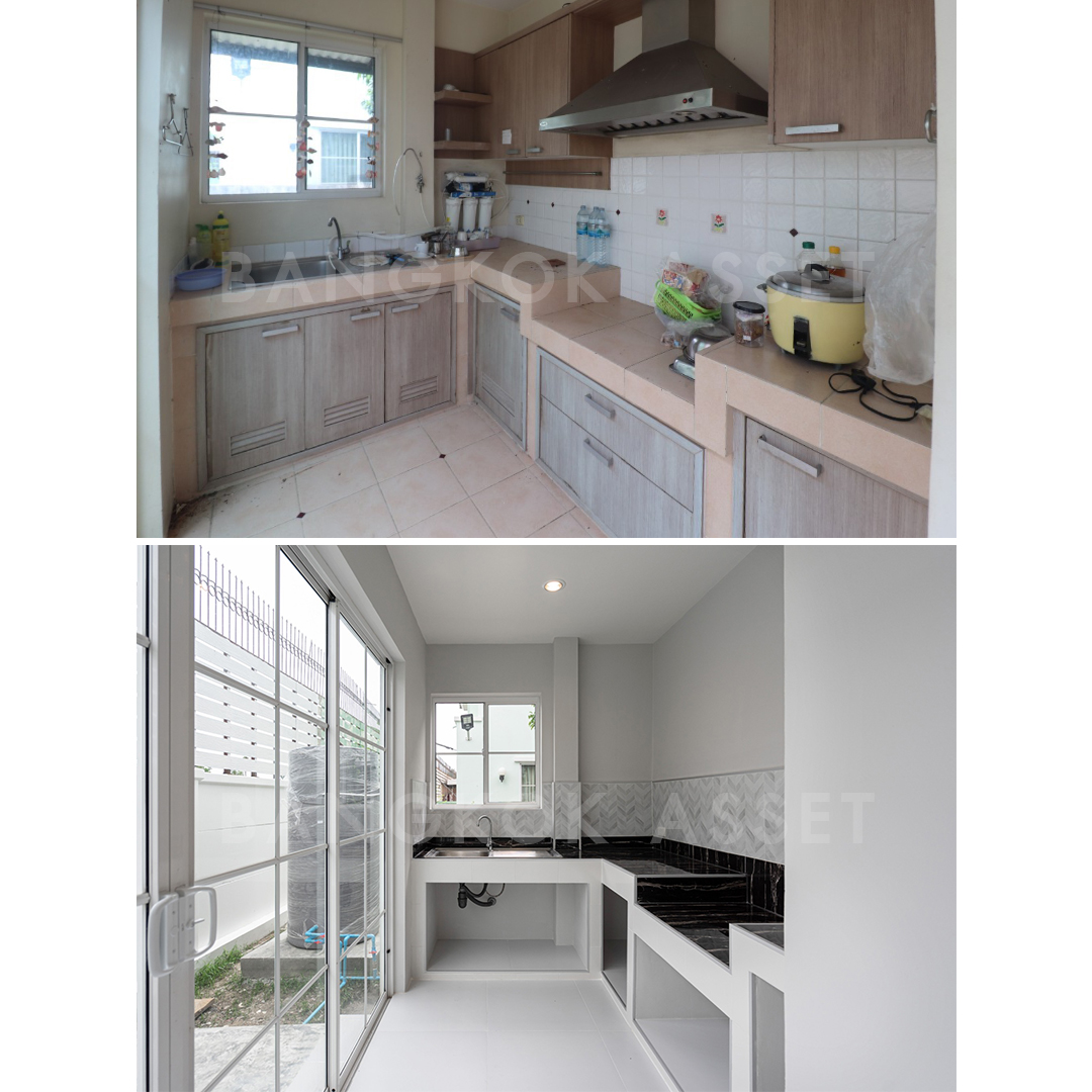 ห้องครัว เราเปลี่ยนกระเบื้องใหม่ให้ทั้งพื้นและผนัง รวมทั้งเคาน์เตอร์ครัวก็ Top ด้วยกระเบื้องใหม่เพิ่มความสวยงาม แข็งแรง ใช้งานได้อีกนาน ส่วนประตูหน้าต่าง เราก็เปลี่ยนให้ใหม่เหมือนกันครับ