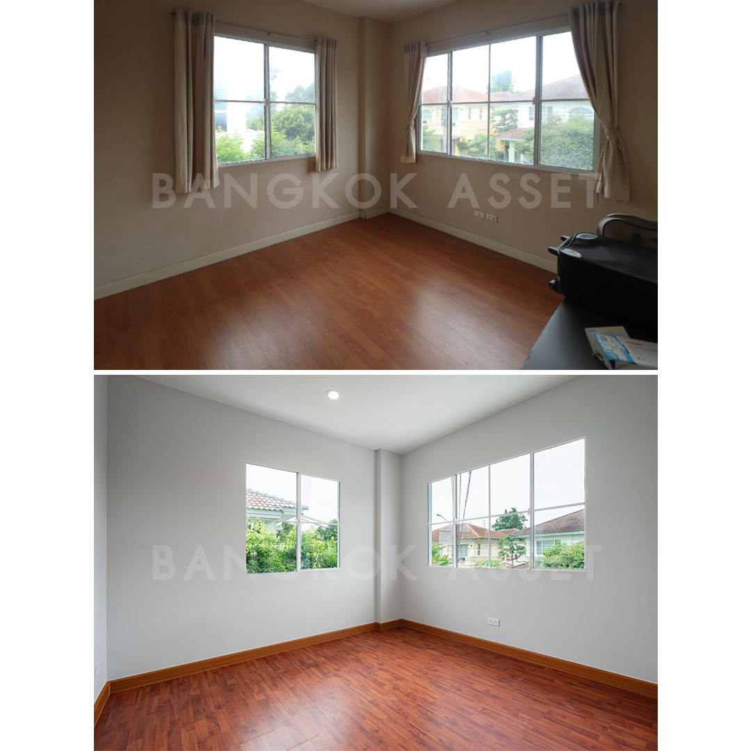 ห้องนอนทุกห้องเราเปลี่ยนประตู หน้าต่าง รวมถึงฝ้าเพดาน พร้อมติดไฟดาวน์ไลท์ให้เช่นกัน และเปลี่ยนพื้นเป็นลามิเนตลายไม้จริงให้ใหม่ทั้งหมด ดูอบอุ่นขึ้น และมีความหนามากยิ่งขึ้น