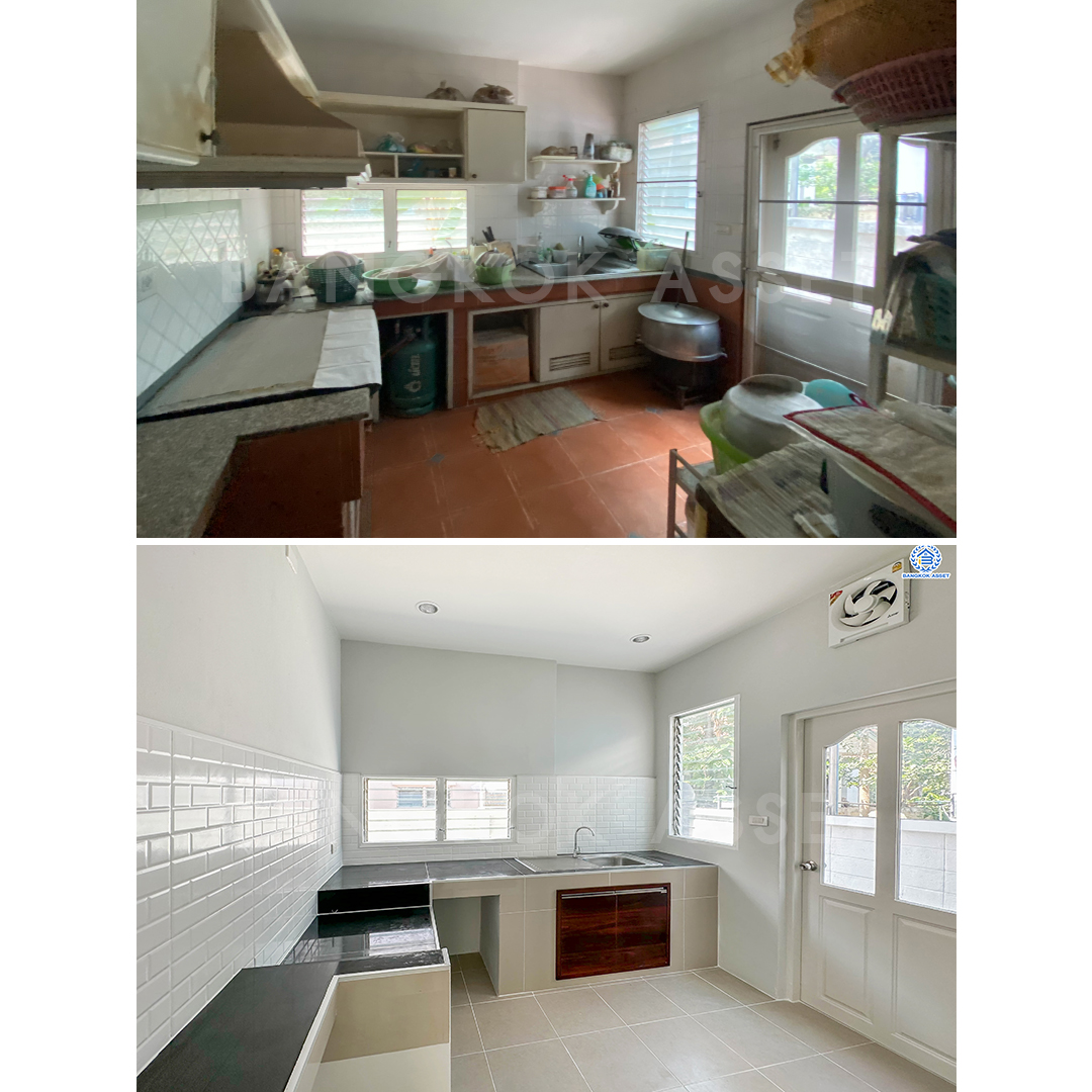 ห้องครัว เราเปลี่ยนกระเบื้องใหม่ให้ทั้งพื้น ผนัง และเคาน์เตอร์ครัว เหมือนบ้านต่อเติมใหม่ ใช้งานได้อีกยาวเลยครับ