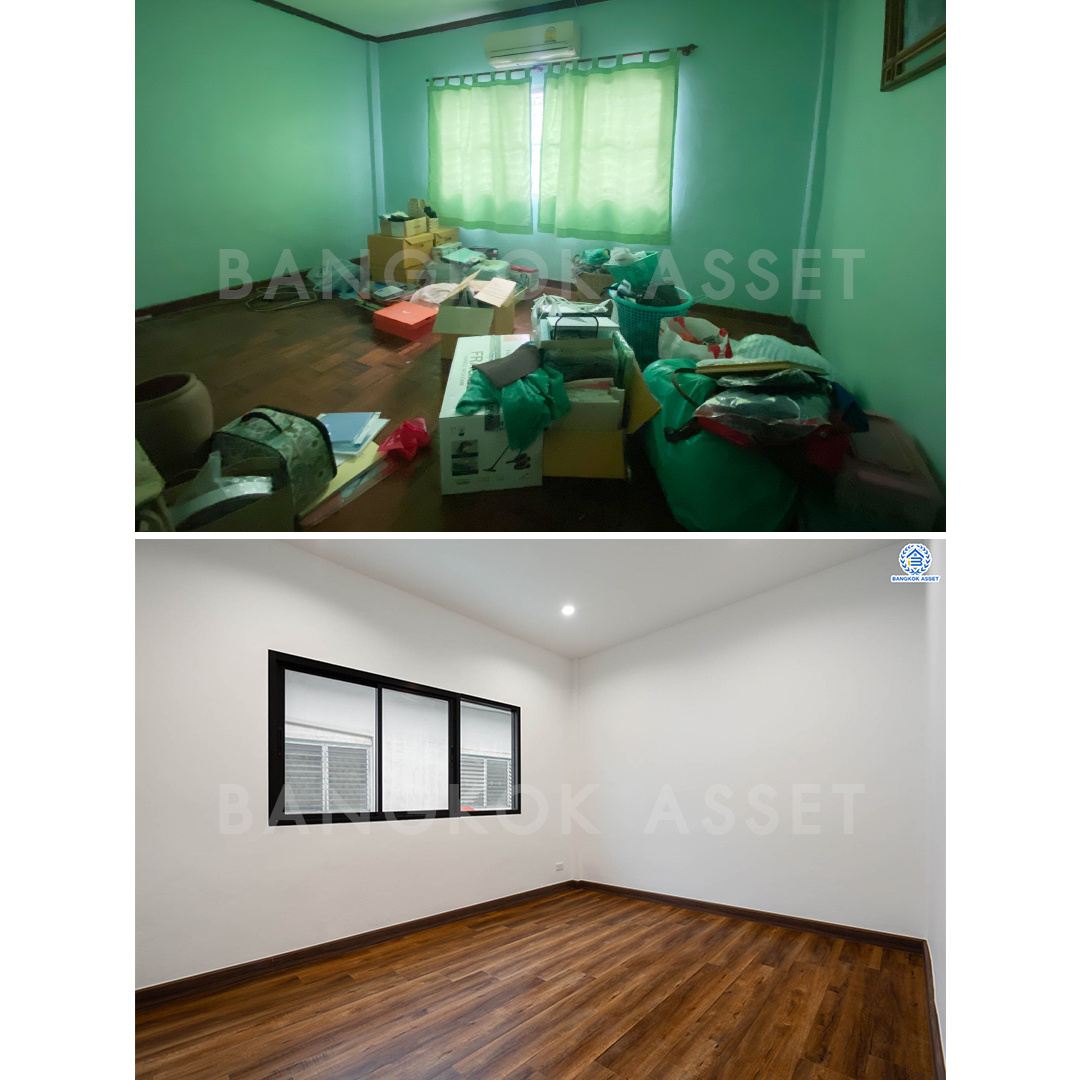 ห้องนอนทุกห้องเราเปลี่ยนประตู หน้าต่าง ฝ้าเพดานเราให้ใหม่ พร้อมติดไฟดาวน์ไลท์ให้เช่นกัน และเปลี่ยนพื้นทุกห้องเป็นไม้ลามิเนตลายเหมือนไม้จริง ดูอบอุ่น สบาย เพิ่มความสวยงามเหมือนเป็นบ้านใหม่จริง ๆ