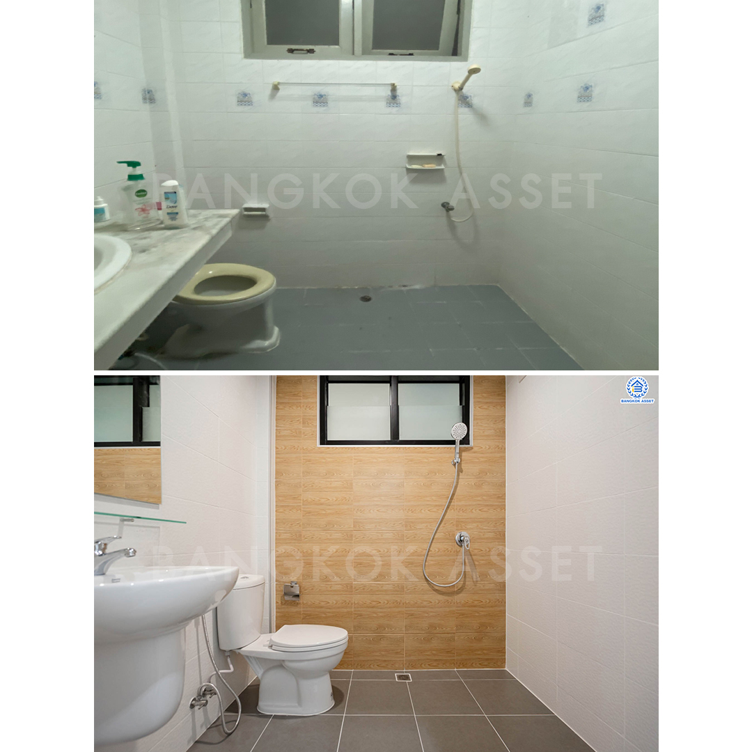 ห้องน้ำเรียกว่าทำให้ใหม่ทั้งหมด ไม่ว่าจะเปลี่ยนสุขภัณฑ์ใหม่ เปลี่ยนกระเบื้องผนังใหม่ เปลี่ยนกระเบื้องพื้นแบบกันลื่น และเรายังตรวจสอบระบบระบายน้ำ ระบบไฟฟ้าให้พร้อมใช้งานได้อย่างดี ส่วนไหนใช้ไม่ได้เราเปลี่ยนให้ใหม่เลยครับ