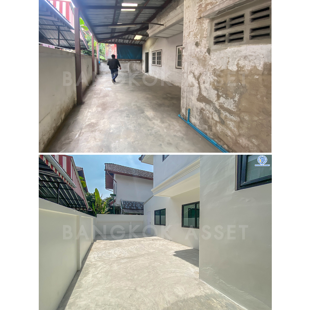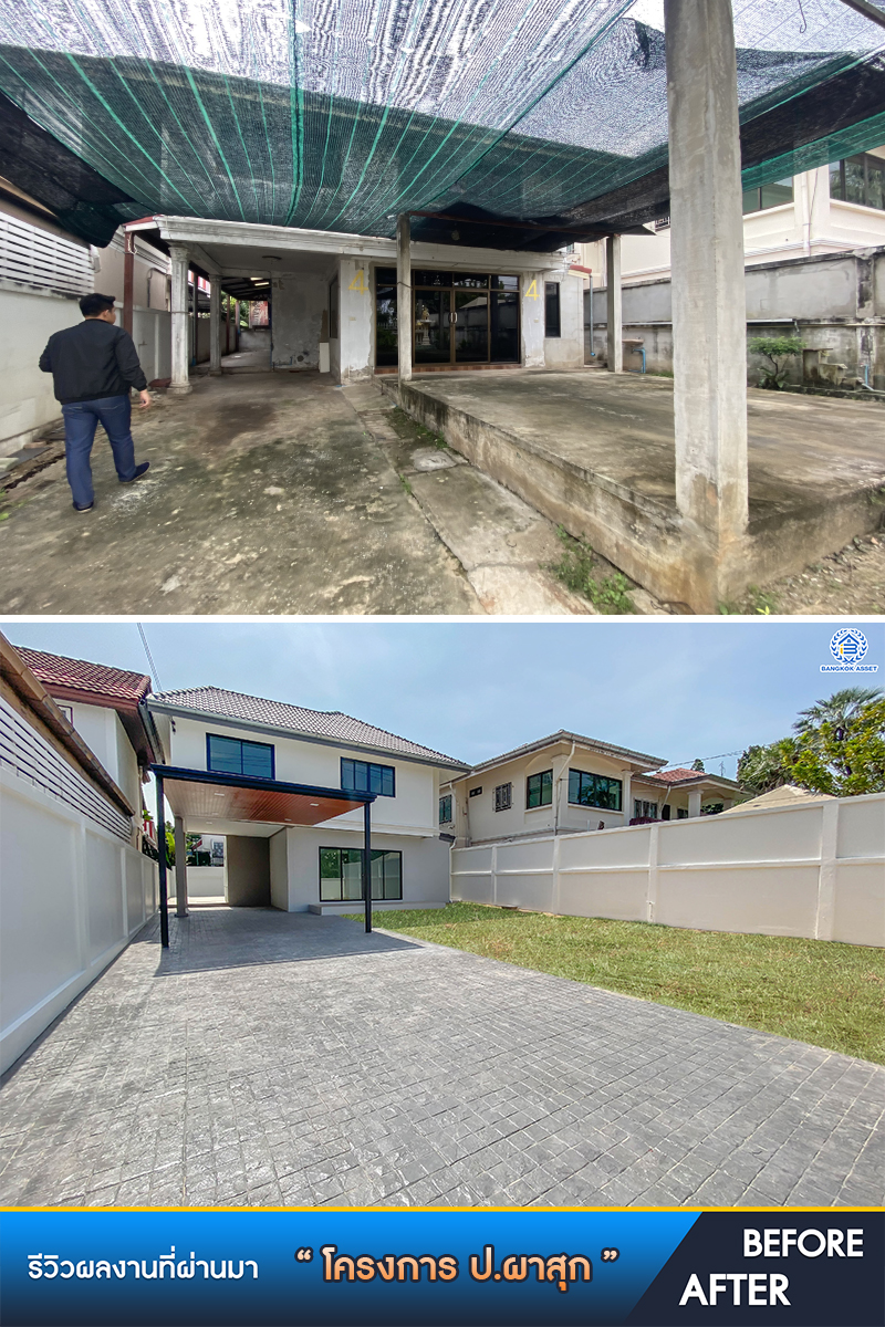 จากบ้านหลังเก่าที่ถูกปล่อยทิ้งไว้นาน เราได้แปลงสภาพใหม่ให้ เคลียร์พื้นที่ทั้งหมดให้โปร่งโล่งน่าอยู่ พร้อมทาสีใหม่ให้ดูขาวสว่างยิ่งขึ้น ส่วนพื้นที่จอดรถ เราต่อเติมหลังคาจอดรถให้ใหม่โดยไม่ต้องไปทำเพิ่ม และพื้นเราเปลี่ยนเป็นพื้นทรายล้างดูสวยงาม แข็งแรง และกันลื่นได้เป็นอย่างดี