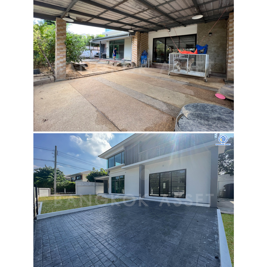 อัพเกรดพื้นที่จอดรถเป็นพื้นคอนกรีตพิมพ์ลาย (Stamped Concrete) เพิ่มความสวยงามและความแข็งแรงมากขึ้น พร้อมปูหญ้าให้ใหม่ ทำให้หน้าบ้านดูหรูหราน่าอยู่ขึ้นจริง ๆ