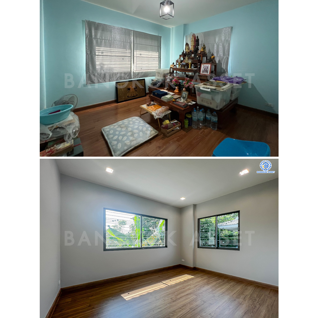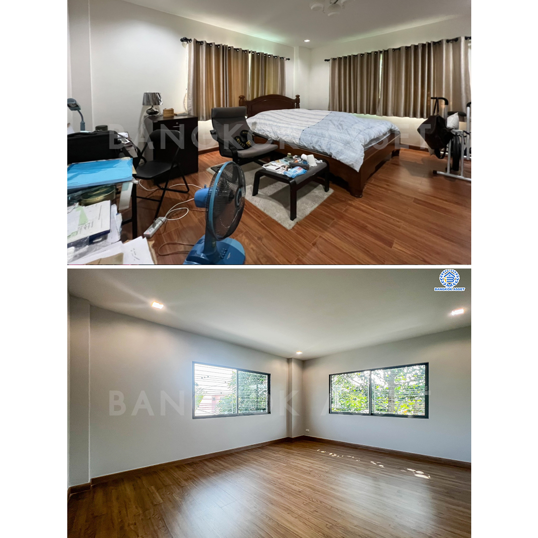 ห้องนอนทุกห้องเราเปลี่ยนเป็นพื้นลามิเนตลายไม้จริงให้ใหม่ทั้งหมด เป็นลายที่นิยมใช้ในบ้านยุคใหม่ พร้อมคุมโทนสีภายในห้องเป็นโทนขาวสว่าง ทำให้รู้สึกโปร่งโล่งขึ้น และผ่อนคลายมากขึ้น