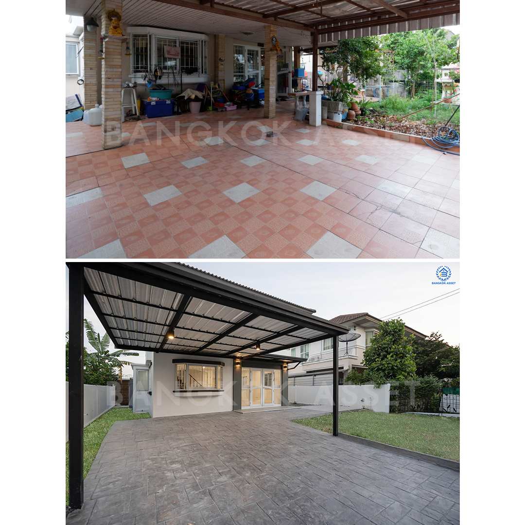 บริเวณที่จอดเราเปลี่ยนหลังคาให้ใหม่ และอัพเกรดพื้นใหม่ เป็นพื้นคอนกรีตพิมพ์ลาย หรือ Stamped Concrete ช่วยเพิ่มสีสันและความแรงของพื้นผิวได้ดี ลวดลายสวยเป็นธรรมชาติ พร้อมปูหญ้าให้ใหม่ ทำให้หน้าบ้านดูหรูน่าอยู่ขึ้นมาก