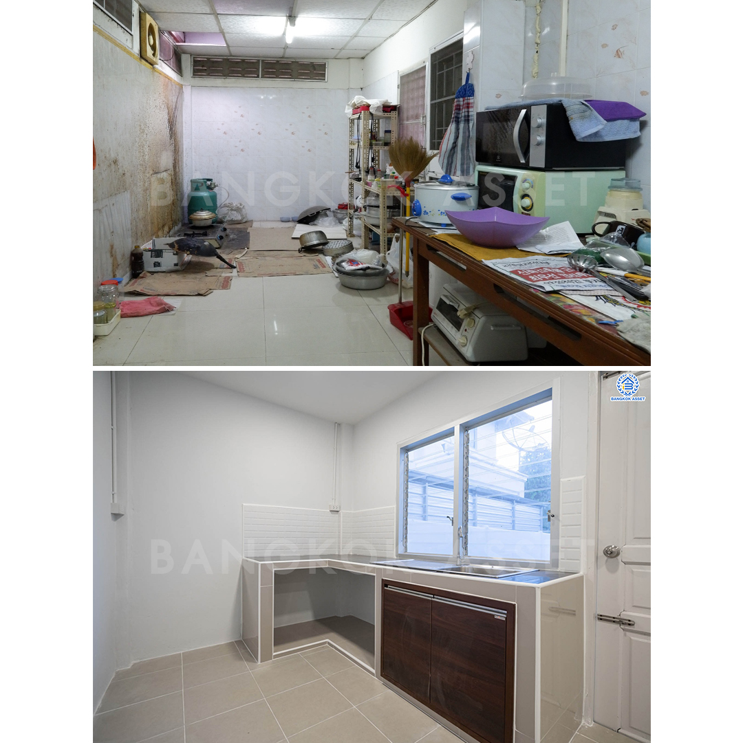 ห้องครัว เปลี่ยนทุกอย่างที่เห็นยกเว้นโครงสร้าง ไม่ว่าจะเป็นกระเบื้องพื้น ผนัง และเคาน์เตอร์ครัว ฝ้าเพดาน ประตู หน้าต่าง เราก็เปลี่ยนให้ใหม่ทั้งหมด เหมือนได้ครัวใหม่ไปเลย