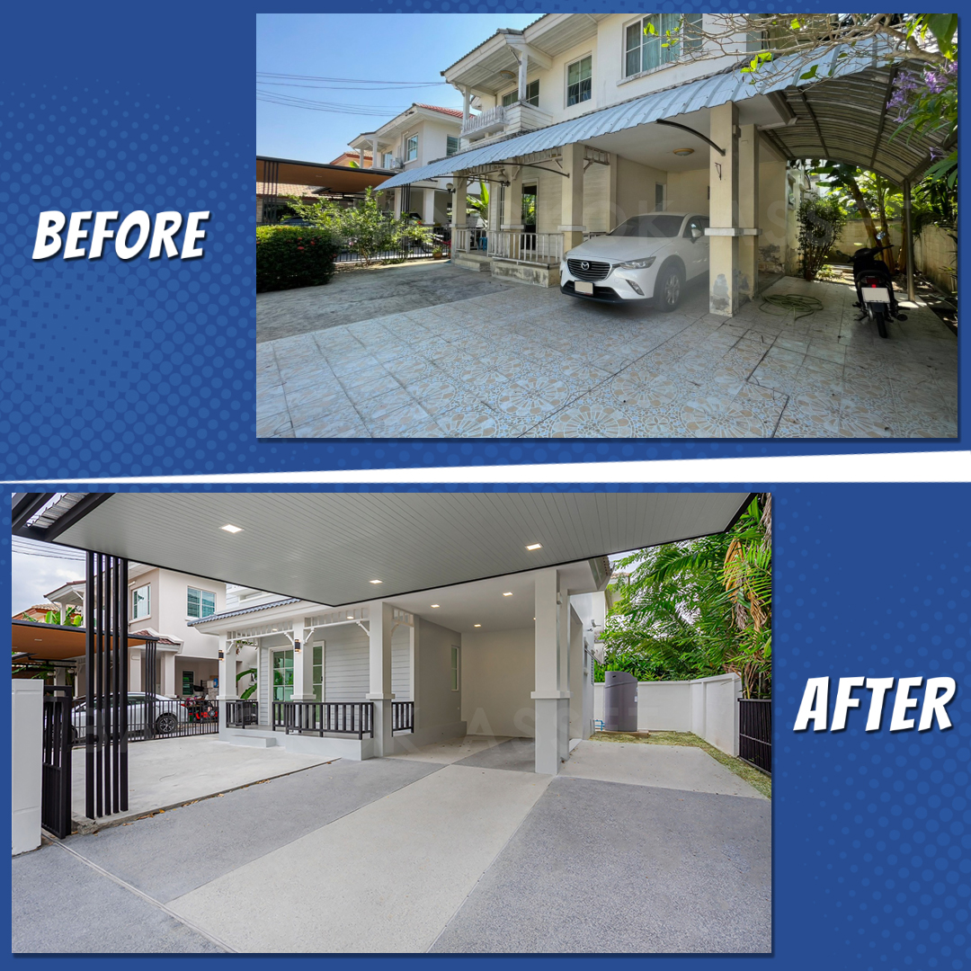 ต่อเติมหลังคาลานจอดรถใหม่ พร้อมอัพเกรดพื้นมาเป็นพื้นทรายล้างที่กันลืนได้อย่างดี และทำให้หน้าบ้านดูสวยหรู ทันสมัยมากขึ้นด้วย