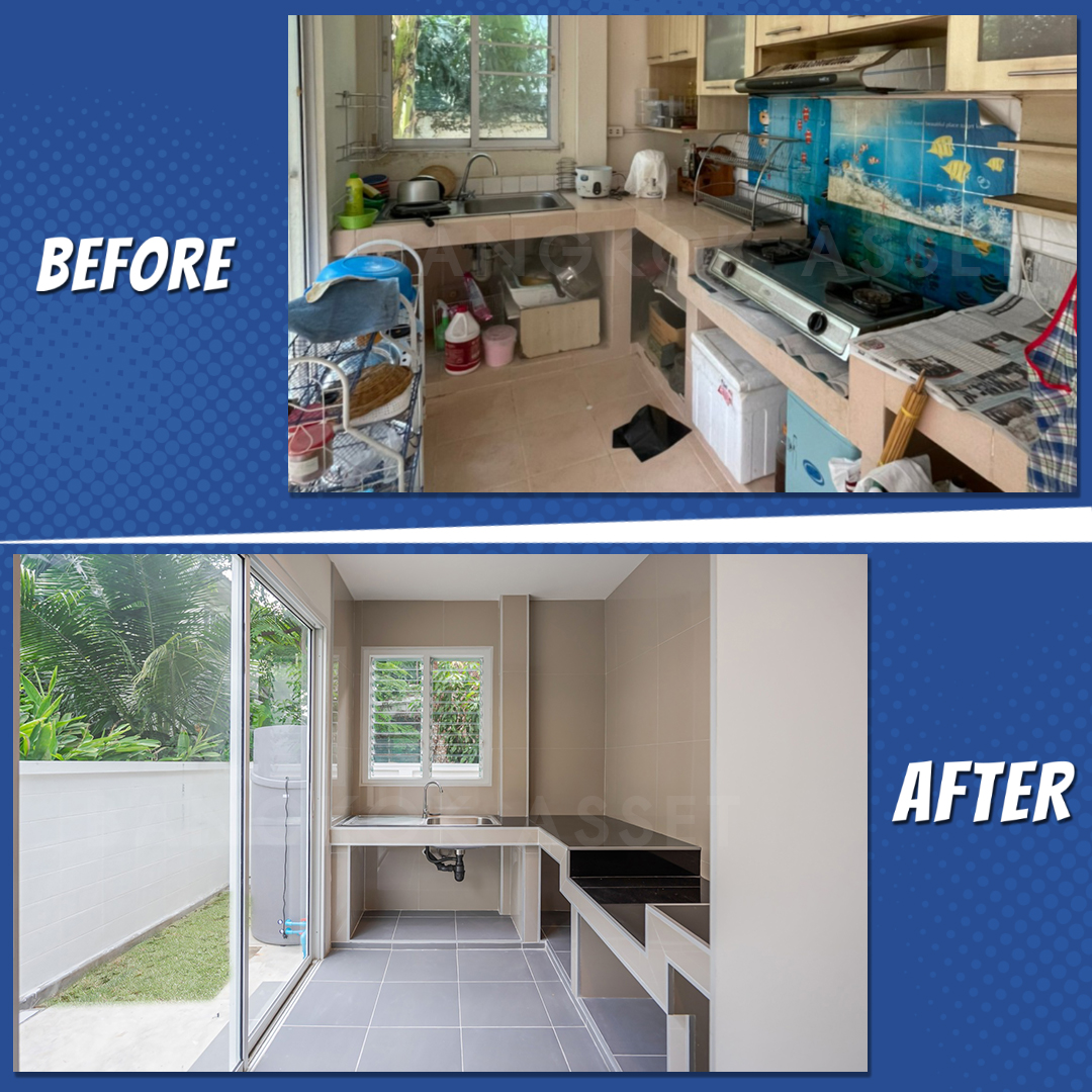 ห้องครัว เราเปลี่ยนกระเบื้องใหม่ทั้งพื้นและผนัง รวมไปถึงเคาน์เตอร์ครัว นอกจากความสวยงามแล้ว ยังเพิ่มความแข็งแรงด้วย