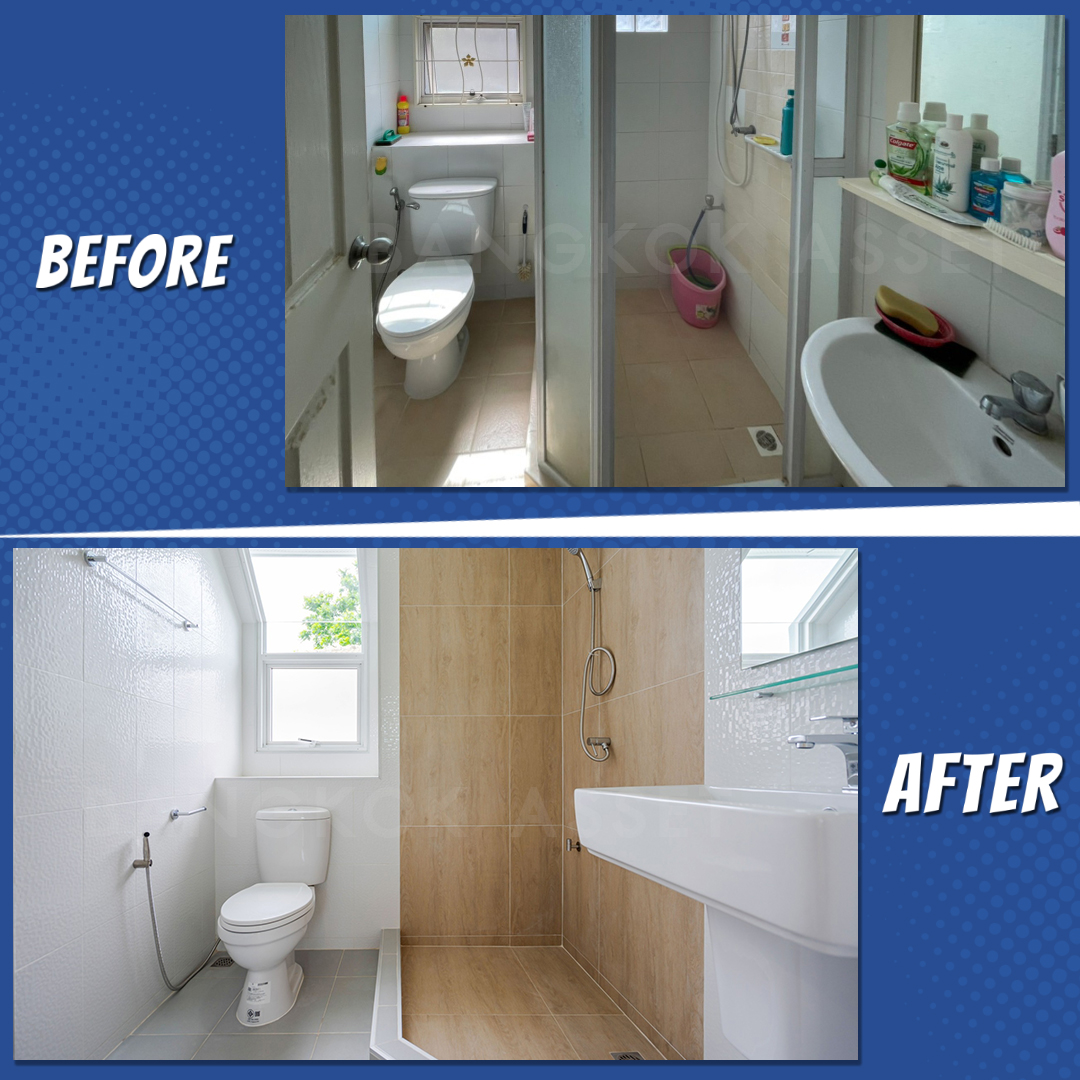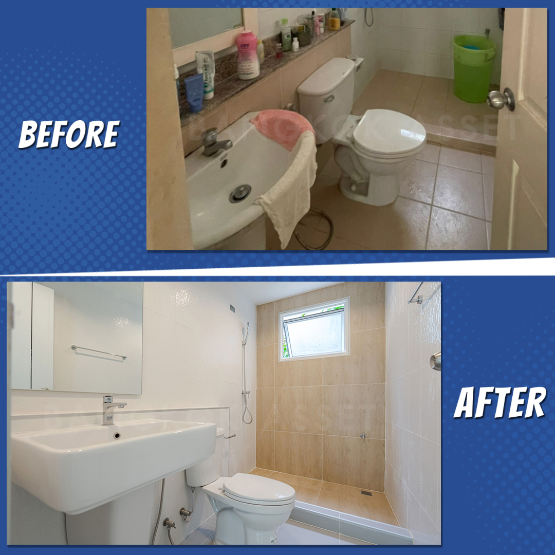 ห้องน้ำตกแต่งสไตล์โมเดิร์นเปลี่ยนสุขภัณฑ์พร้อมอุปกรณ์ให้ใหม่ทั้งหมด เปลี่ยนกระเบื้องผนัง และเพิ่มความปลอดภัยในการใช้งานด้วยการเปลี่ยนกระเบื้องพื้นแบบกันลื่น นอกจากนี้เรายังตรวจสอบดูแลระบบน้ำ ระบบไฟให้พร้อมใช้งานได้ 100% ด้วยครับ