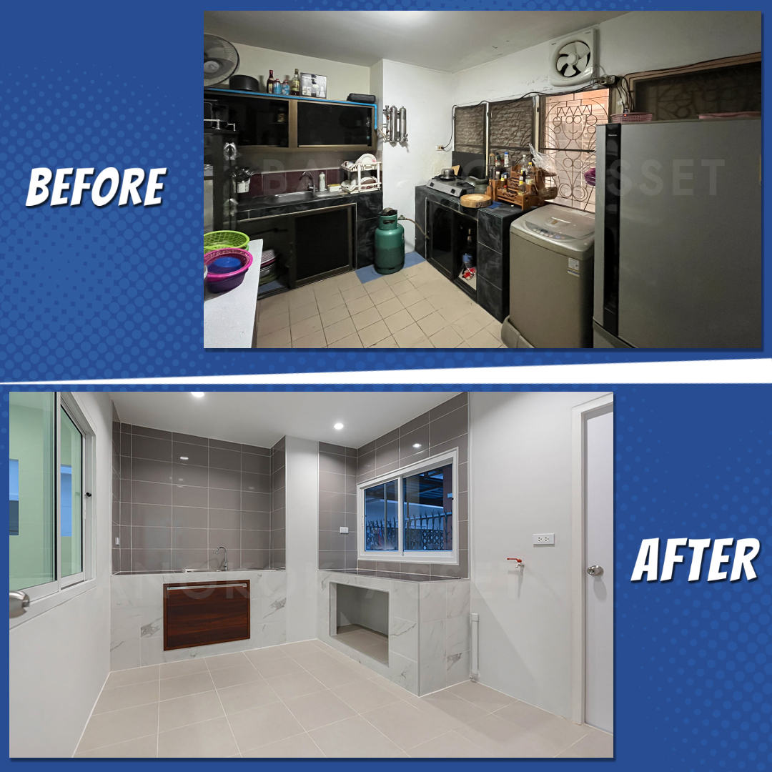 ห้องครัว เปลี่ยนเป็นพื้นกระเบื้องทั้งพื้น และผนัง รวมถึงเคาน์เตอร์ครัวก็เปลี่ยนกระเบื้องให้ใหม่ และเปลี่ยนหน้าต่างระบายอากาศให้ด้วย