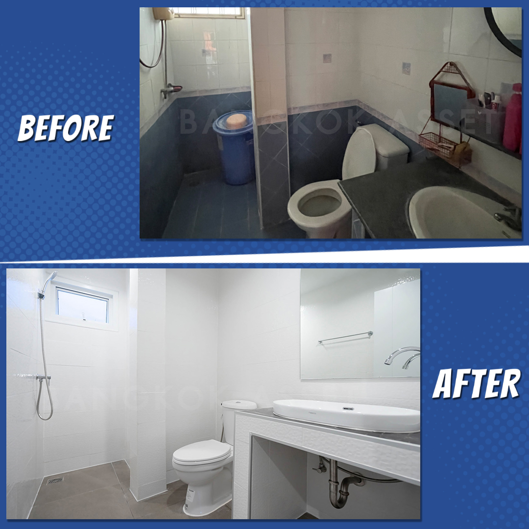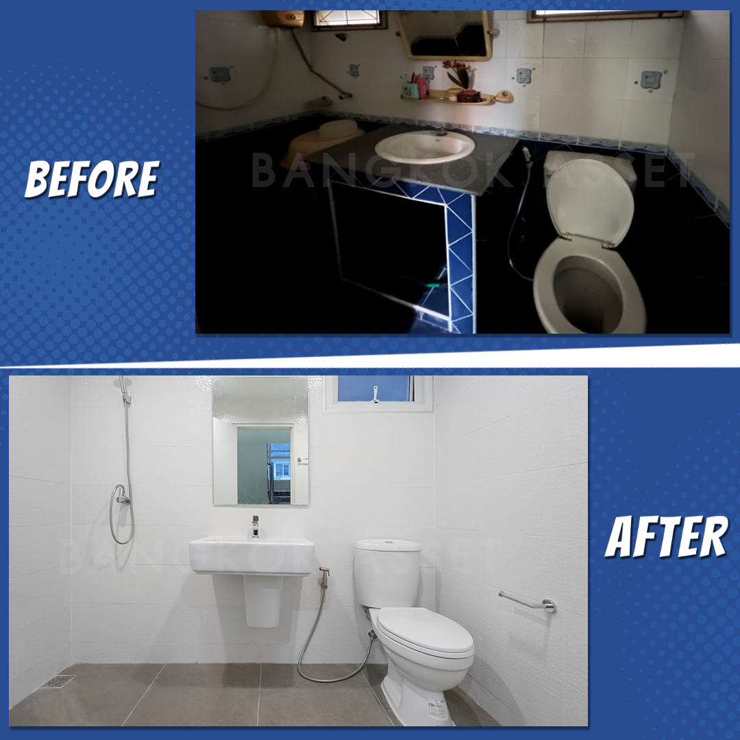 ห้องน้ำ เราเปลี่ยนสุขภัณฑ์ใหม่ให้ทุกห้อง รวมทั้งอุปกรณ์ห้องน้ำทั้งหมด เปลี่ยนกระเบื้องพื้นและผนังใหม่ พร้อมดูแลระบบระบายน้ำ ระบบไฟฟ้าให้พร้อมใช้งานได้เป็นอย่างดีเลยครับ