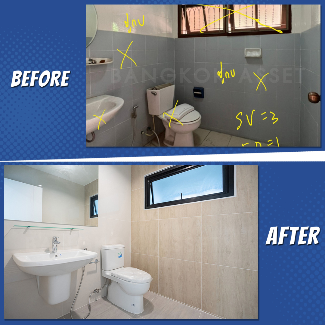 ห้องน้ำ เปลี่ยนสุขภัณฑ์ใหม่ เปลี่ยนกระเบื้องใหม่ทั้งพื้นและผนัง พร้อมดูแลเรื่องระบบน้ำ ระบบไฟฟ้าให้พร้อมใช้งานได้อย่างไม่มีปัญหา