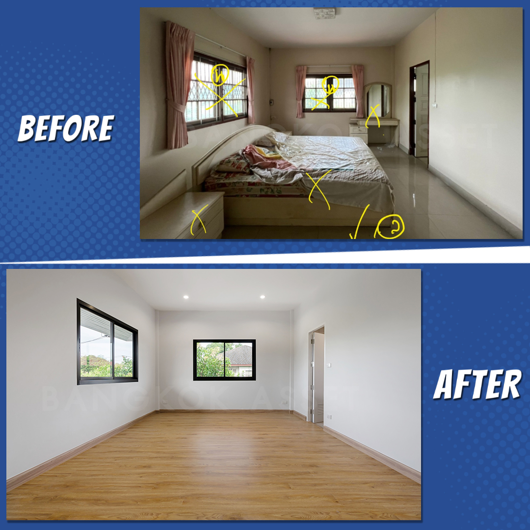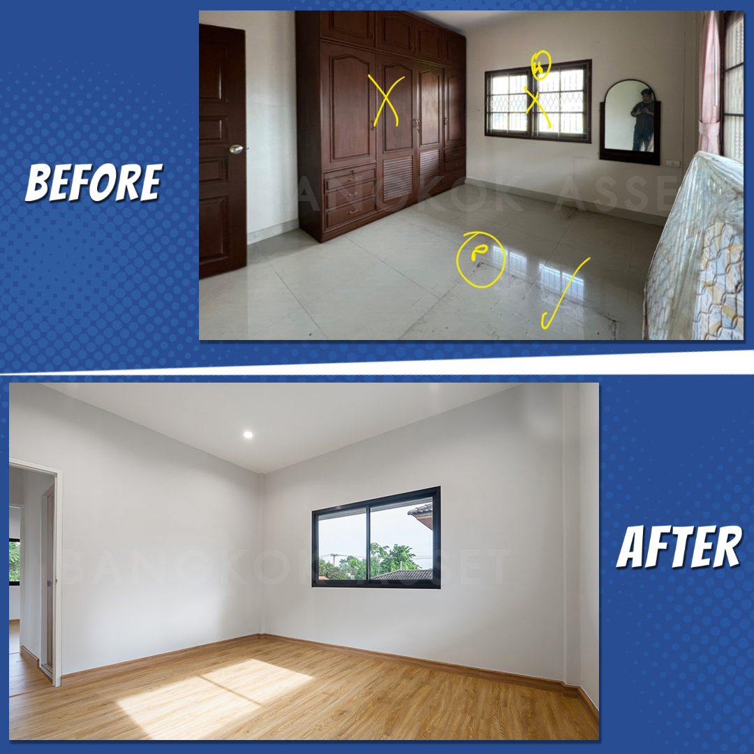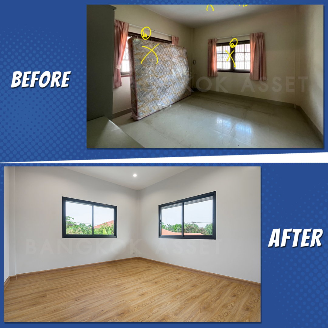 ห้องนอนทุกห้อง เราเปลี่ยนประตูหน้าต่างใหม่ เปลี่ยนพื้นเป็นลามิเนตลายไม้จริงใหม่ทั้งหมด ให้ความสวยงามคงทน เพิ่มความรู้สึกผ่อนคลายให้กับผู้อยู่อาศัย