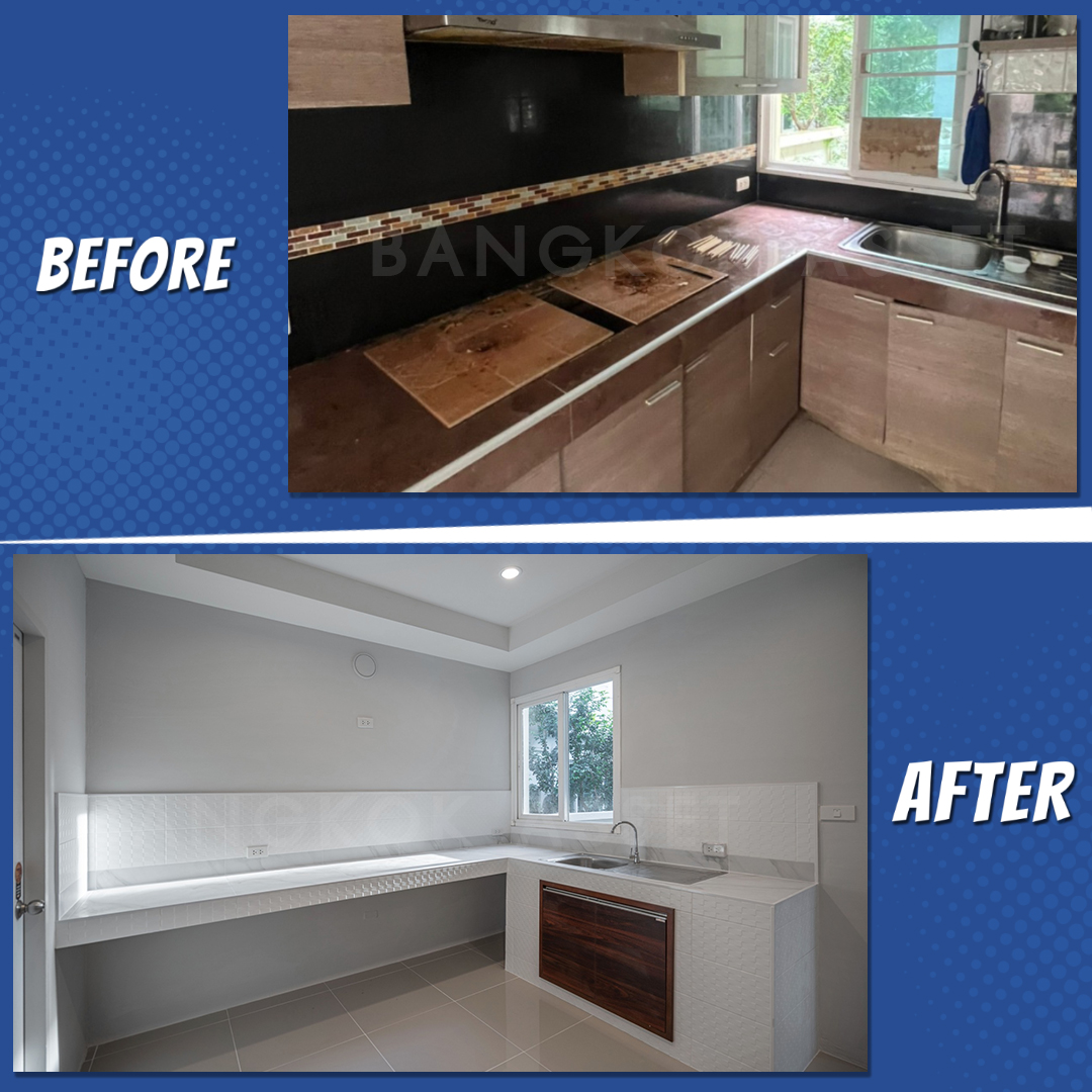 ห้องครัว เราเปลี่ยนกระเบื้องใหม่ให้ทั้งพื้นและผนัง รวมถึงเคาน์เตอร์ครัว ให้ความแข็งแรง ทนทาน ใช้งานได้อีกนาน