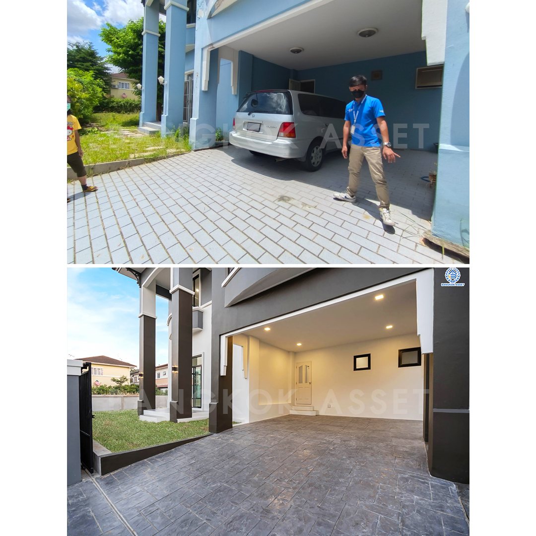 เปลี่ยนพื้นที่จอดรถเป็นพื้นคอนกรีตแสตมป์ลวดลายสวยธรรมชาติ มีความแข็งแรง พร้อมปูหญ้าให้ใหม่ ทำให้หน้าบ้านดูสวยหรูทันสมัยยิ่งขึ้น