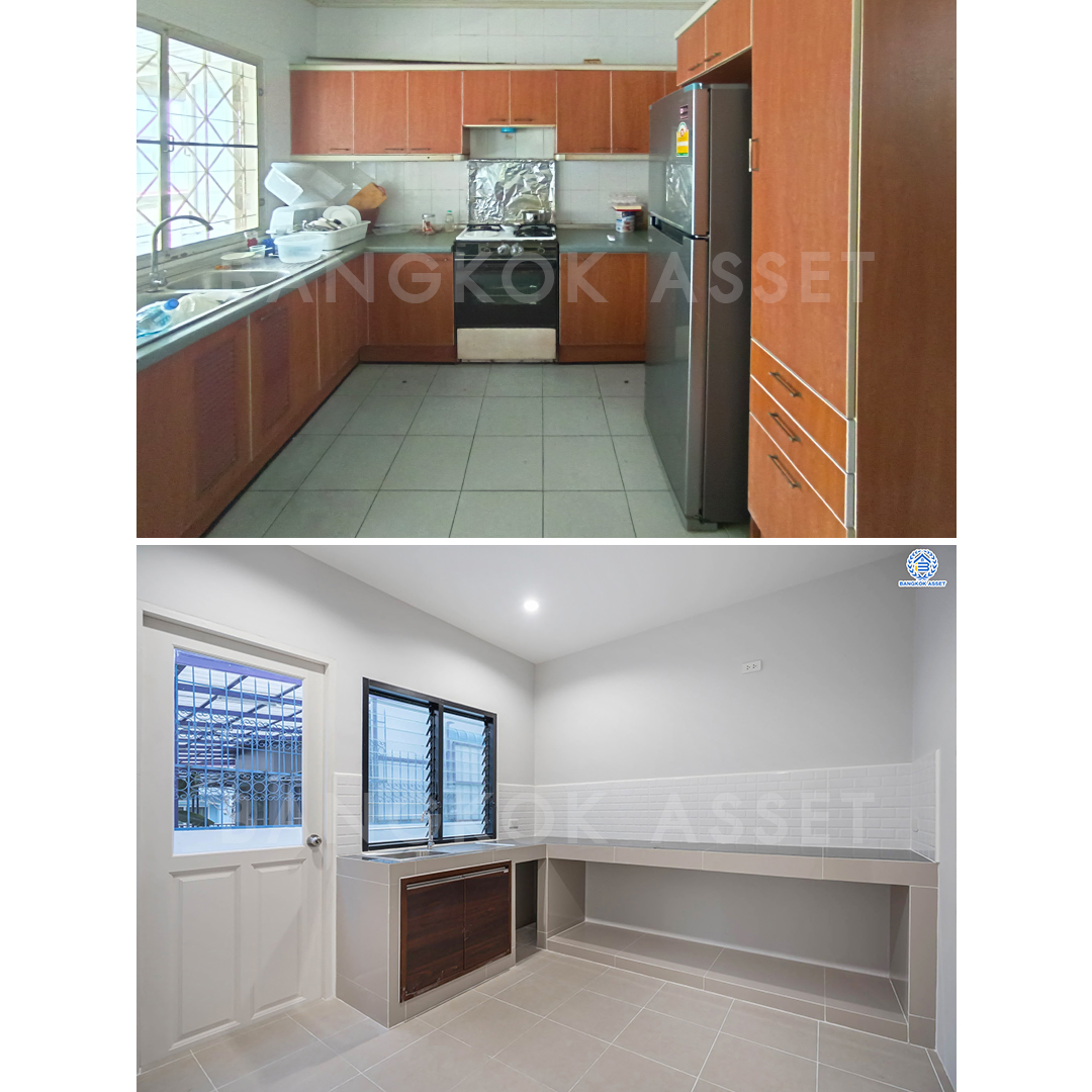 ห้องครัว เปลี่ยนกระเบื้องทั้งพื้น และผนัง พร้อมเปลี่ยนเคาน์เตอร์ครัวก่อปูนใหม่ เพิ่มความแข็งแรง ใช้งานได้อีกยาว ๆ รวมถึงประตูหน้าต่างที่เก่าแล้วก็เปลี่ยนใหม่เช่นกัน