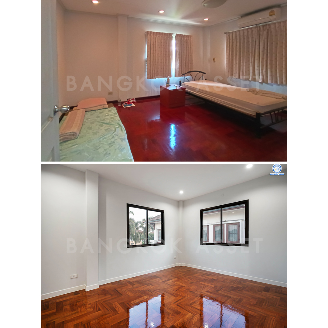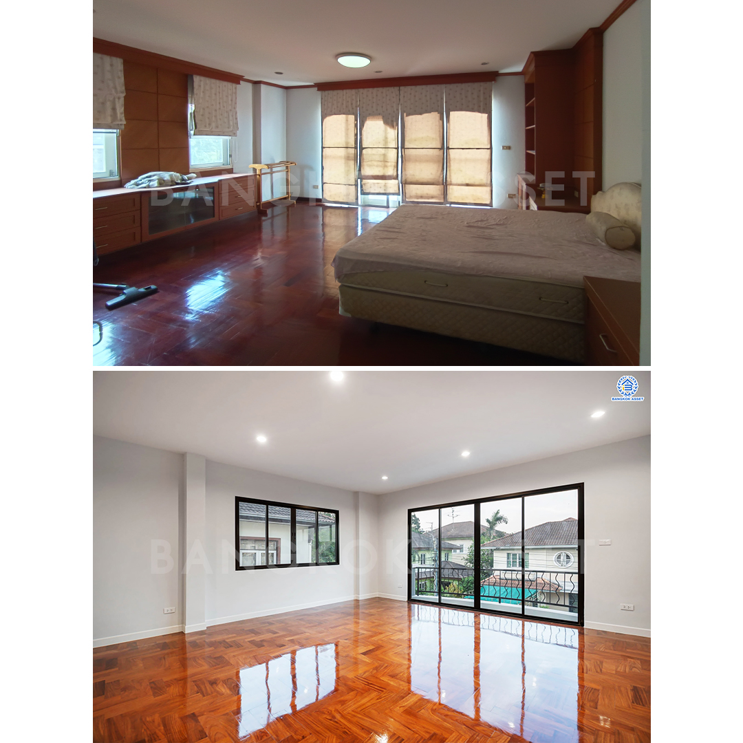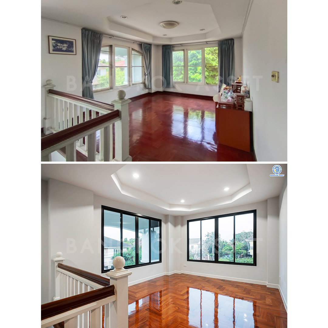 ห้องนอนทุกห้องเราขัดเคลือบพื้นไม้ปาร์เกต์ให้ใหม่ทั้งหมด เปลี่ยนประตู หน้าต่างอลูมิเนียม พร้อมติดตั้งไฟดาวน์ไลท์ใหม่ทุกห้องเลยครับ