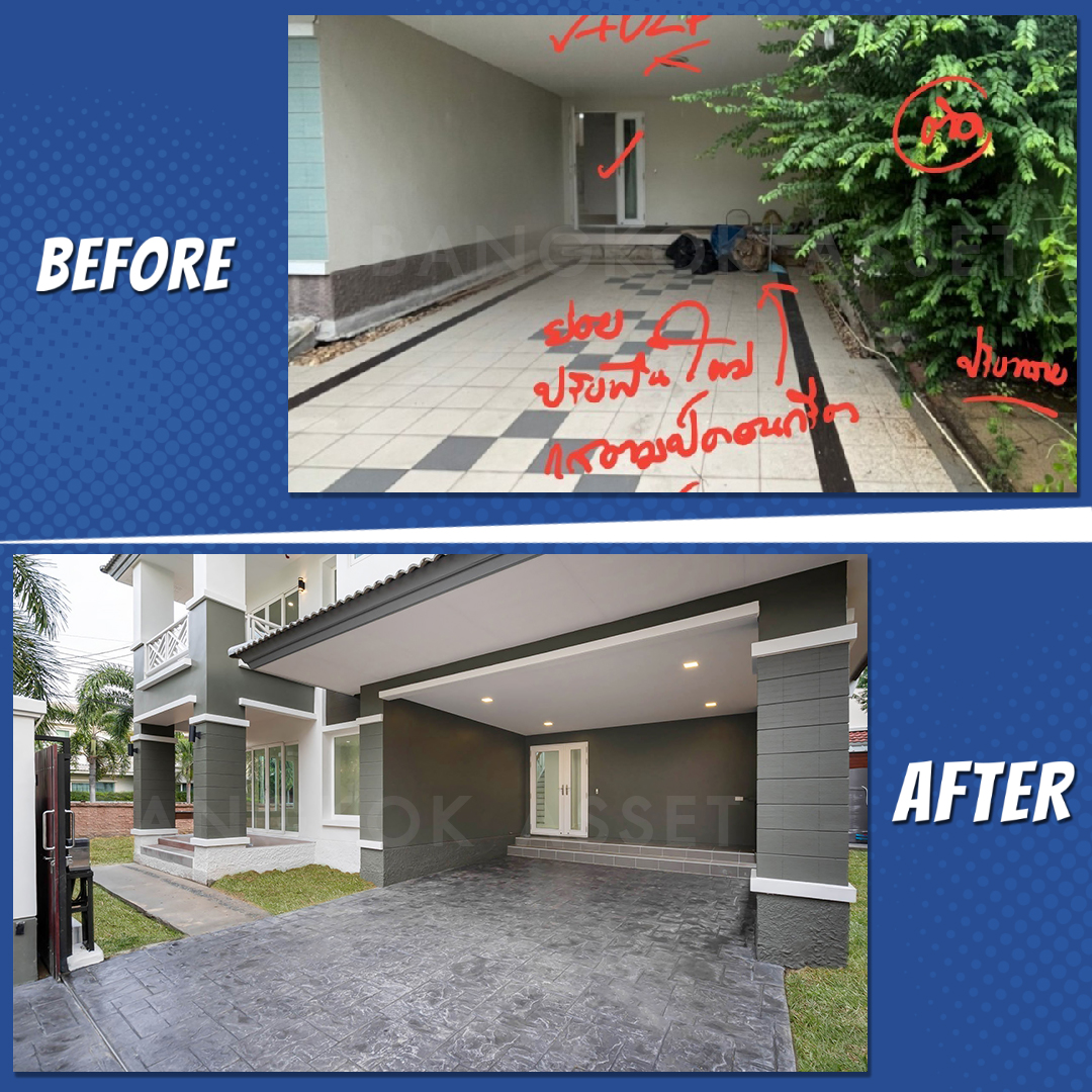 เริ่มจากเคลียร์ต้นไม้ที่ขึ้นรก และเปลี่ยนวัสดุใหม่ให้ทั้งหมด ทาสีใหม่ให้ดูขาวสว่างยิ่งขึ้น