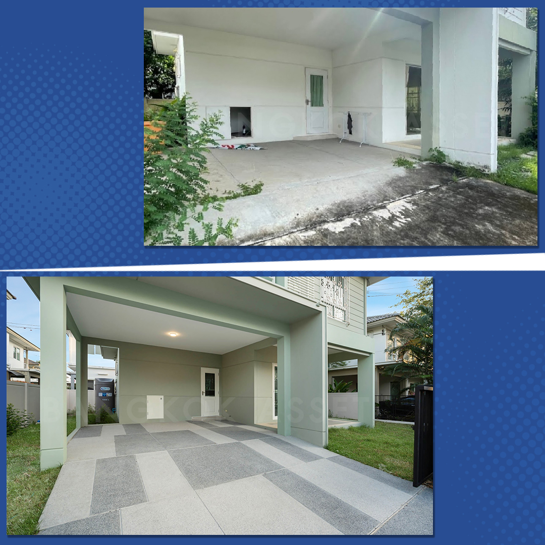 อัพเกรดพื้นที่จอดรถเป็นพื้นทรายล้างกันลื่น ลวดลายสวยงาม พร้อมปูหญ้าให้ใหม่ ทำให้หน้าบ้านดูสวยใหม่ในสไตล์โมเดิร์นมากขึ้น